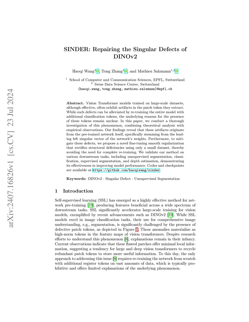 Vision Transformer models trained on large-scale datasets, although effective, often exhibit artifacts in the patch token they extract. While such defects can be alleviated by re-training the entire model with additional classification tokens, the underlying reasons for the presence of these tokens remain unclear. In this paper, we conduct a thorough investigation of this phenomenon, combining theoretical analysis with empirical observations. Our findings reveal that these artifacts originate from the pre-trained network itself, specifically stemming from the leading left singular vector of the network's weights. Furthermore, to mitigate these defects, we propose a novel fine-tuning smooth regularization that rectifies structural deficiencies using only a small dataset, thereby avoiding the need for complete re-training. We validate our method on various downstream tasks, including unsupervised segmentation, classification, supervised segmentation, and depth estimation, demonstrating its effectiveness in improving model performance. Codes and checkpoints are available at https://github.com/haoqiwang/sinder.