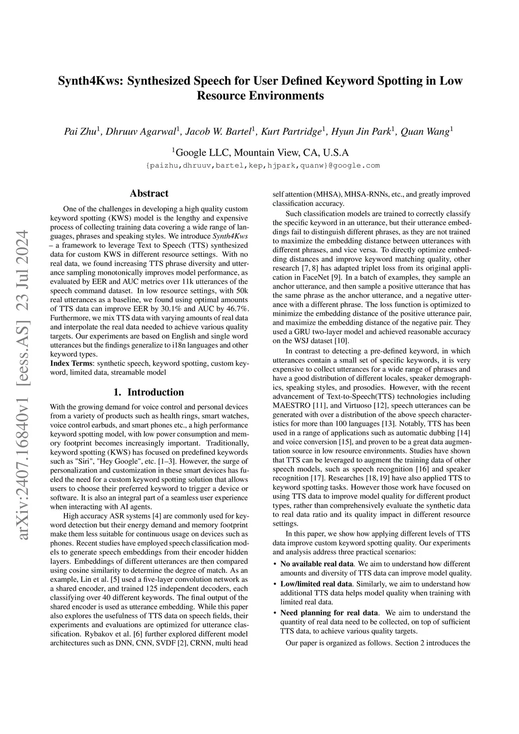 One of the challenges in developing a high quality custom keyword spotting (KWS) model is the lengthy and expensive process of collecting training data covering a wide range of languages, phrases and speaking styles. We introduce Synth4Kws - a framework to leverage Text to Speech (TTS) synthesized data for custom KWS in different resource settings. With no real data, we found increasing TTS phrase diversity and utterance sampling monotonically improves model performance, as evaluated by EER and AUC metrics over 11k utterances of the speech command dataset. In low resource settings, with 50k real utterances as a baseline, we found using optimal amounts of TTS data can improve EER by 30.1% and AUC by 46.7%. Furthermore, we mix TTS data with varying amounts of real data and interpolate the real data needed to achieve various quality targets. Our experiments are based on English and single word utterances but the findings generalize to i18n languages and other keyword types.