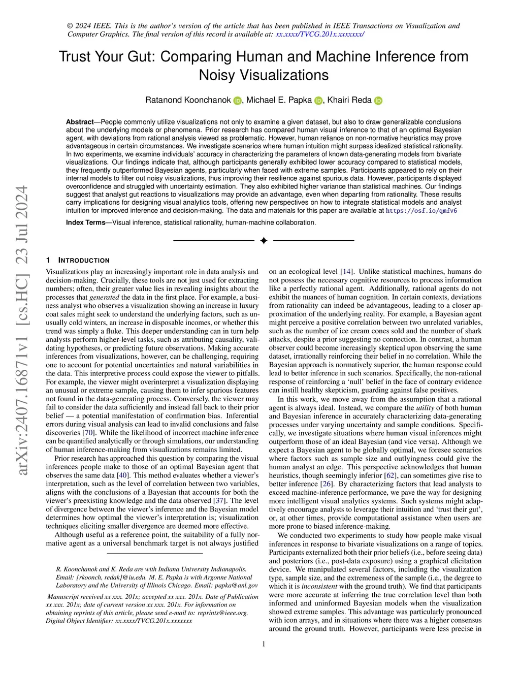 People commonly utilize visualizations not only to examine a given dataset, but also to draw generalizable conclusions about the underlying models or phenomena. Prior research has compared human visual inference to that of an optimal Bayesian agent, with deviations from rational analysis viewed as problematic. However, human reliance on non-normative heuristics may prove advantageous in certain circumstances. We investigate scenarios where human intuition might surpass idealized statistical rationality. In two experiments, we examine individuals' accuracy in characterizing the parameters of known data-generating models from bivariate visualizations. Our findings indicate that, although participants generally exhibited lower accuracy compared to statistical models, they frequently outperformed Bayesian agents, particularly when faced with extreme samples. Participants appeared to rely on their internal models to filter out noisy visualizations, thus improving their resilience against spurious data. However, participants displayed overconfidence and struggled with uncertainty estimation. They also exhibited higher variance than statistical machines. Our findings suggest that analyst gut reactions to visualizations may provide an advantage, even when departing from rationality. These results carry implications for designing visual analytics tools, offering new perspectives on how to integrate statistical models and analyst intuition for improved inference and decision-making. The data and materials for this paper are available at https://osf.io/qmfv6