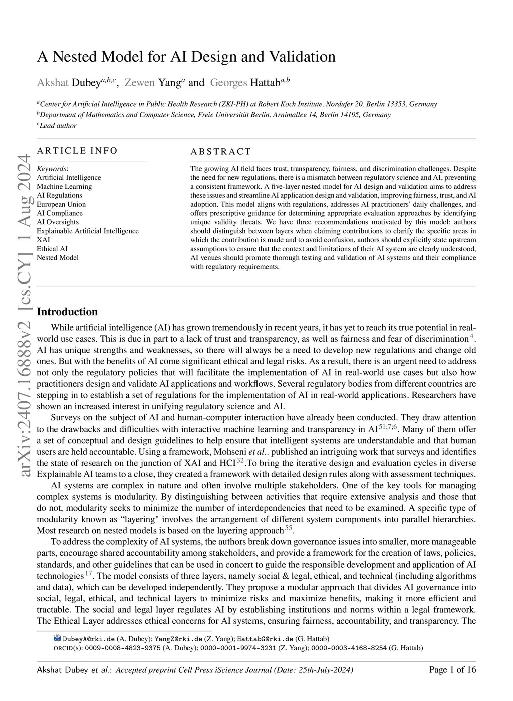 The growing AI field faces trust, transparency, fairness, and discrimination challenges. Despite the need for new regulations, there is a mismatch between regulatory science and AI, preventing a consistent framework. A five-layer nested model for AI design and validation aims to address these issues and streamline AI application design and validation, improving fairness, trust, and AI adoption. This model aligns with regulations, addresses AI practitioner's daily challenges, and offers prescriptive guidance for determining appropriate evaluation approaches by identifying unique validity threats. We have three recommendations motivated by this model: authors should distinguish between layers when claiming contributions to clarify the specific areas in which the contribution is made and to avoid confusion, authors should explicitly state upstream assumptions to ensure that the context and limitations of their AI system are clearly understood, AI venues should promote thorough testing and validation of AI systems and their compliance with regulatory requirements.