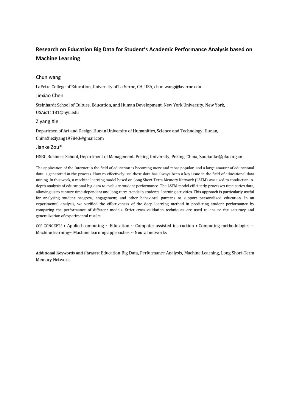 The application of the Internet in the field of education is becoming more and more popular, and a large amount of educational data is generated in the process. How to effectively use these data has always been a key issue in the field of educational data mining. In this work, a machine learning model based on Long Short-Term Memory Network (LSTM) was used to conduct an in-depth analysis of educational big data to evaluate student performance. The LSTM model efficiently processes time series data, allowing us to capture time-dependent and long-term trends in students' learning activities. This approach is particularly useful for analyzing student progress, engagement, and other behavioral patterns to support personalized education. In an experimental analysis, we verified the effectiveness of the deep learning method in predicting student performance by comparing the performance of different models. Strict cross-validation techniques are used to ensure the accuracy and generalization of experimental results.