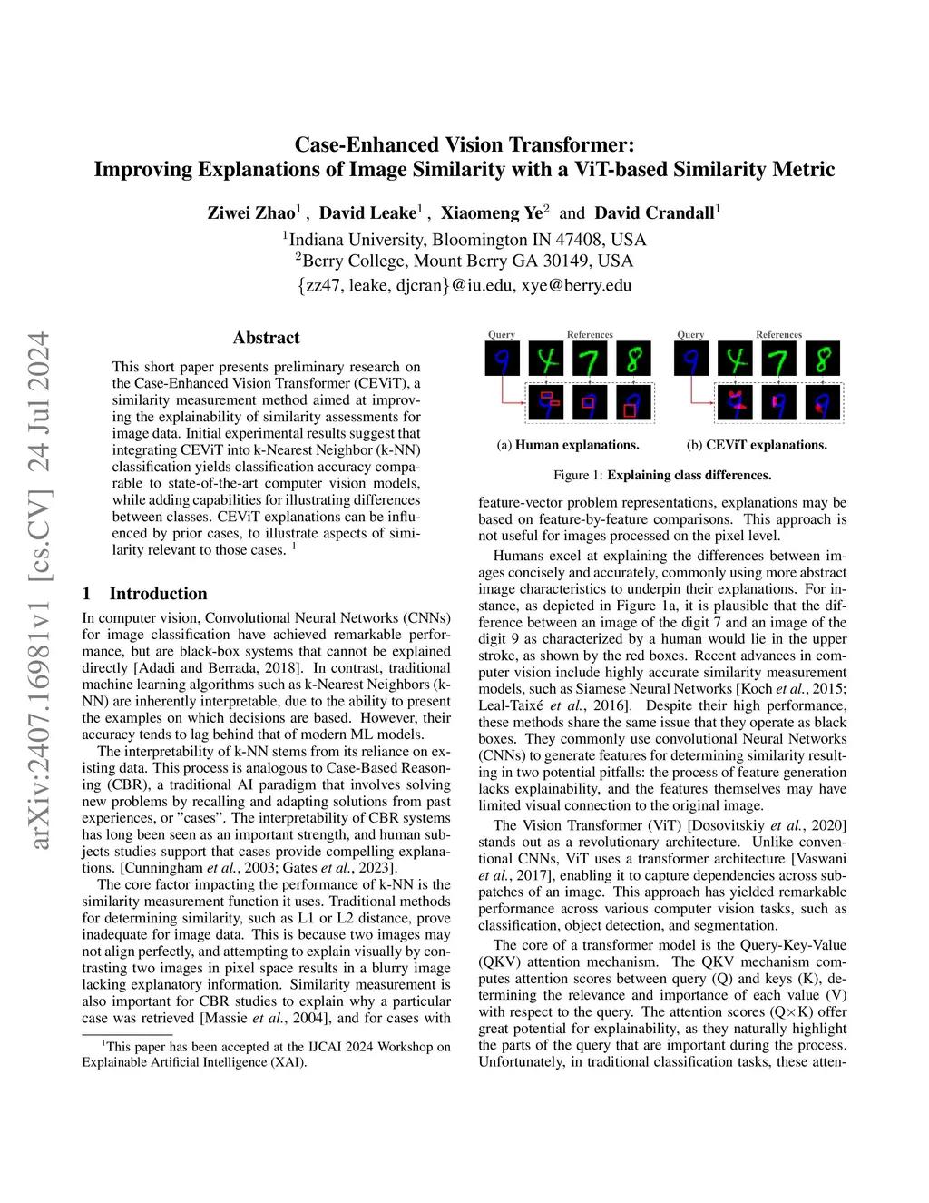 This short paper presents preliminary research on the Case-Enhanced Vision Transformer (CEViT), a similarity measurement method aimed at improving the explainability of similarity assessments for image data. Initial experimental results suggest that integrating CEViT into k-Nearest Neighbor (k-NN) classification yields classification accuracy comparable to state-of-the-art computer vision models, while adding capabilities for illustrating differences between classes. CEViT explanations can be influenced by prior cases, to illustrate aspects of similarity relevant to those cases.