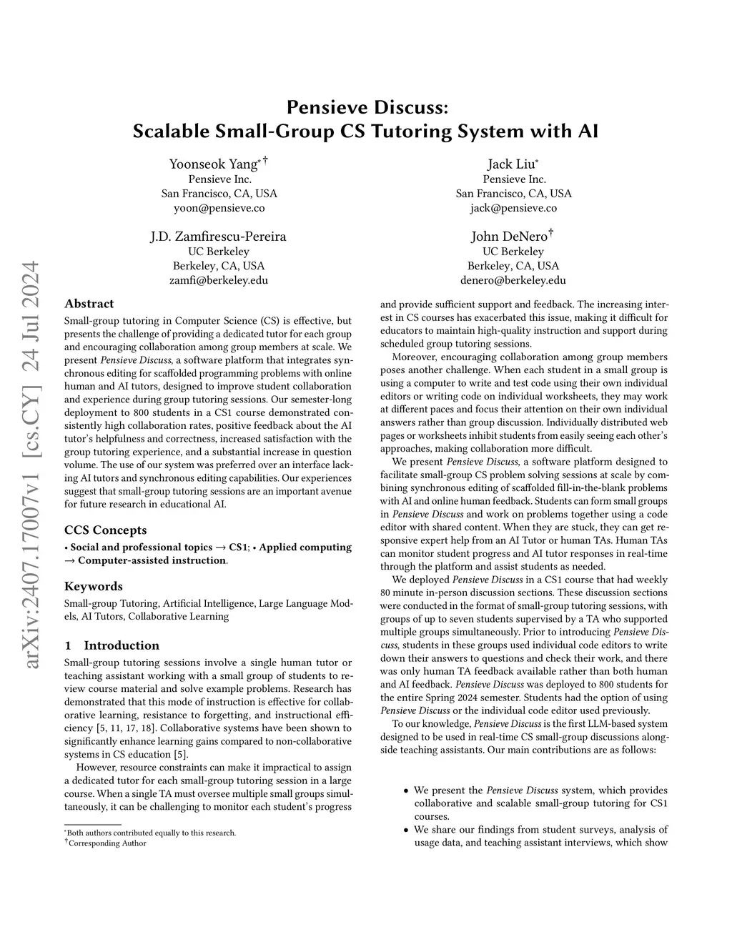 Pensieve Discuss: Scalable Small-Group CS Tutoring System with AI