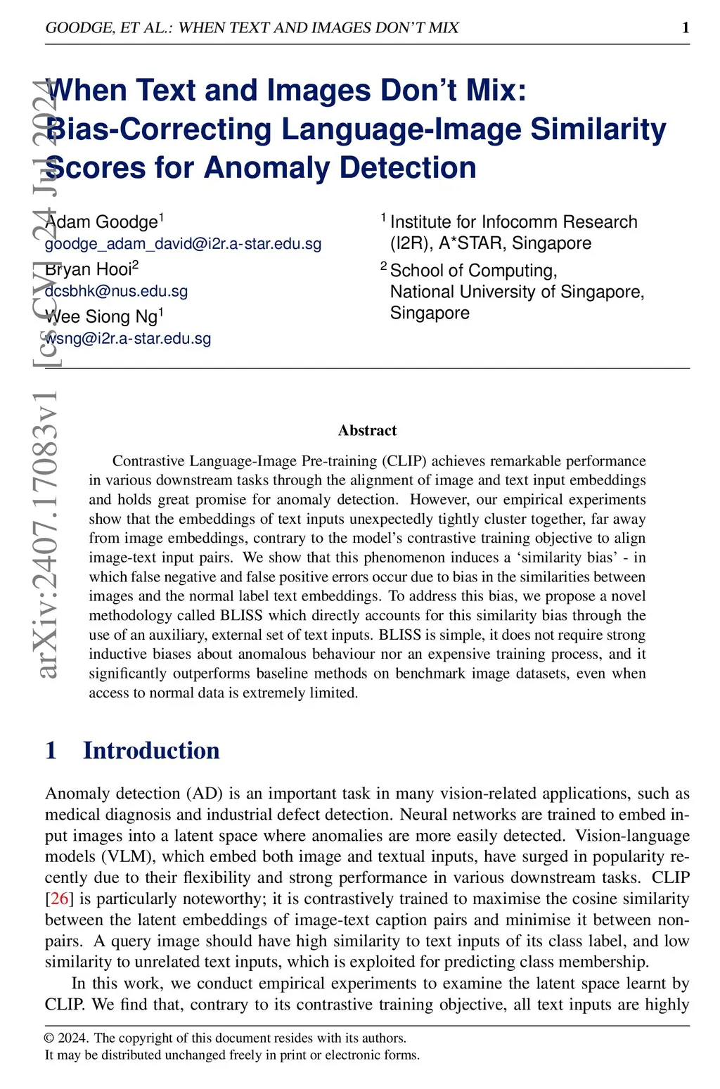 Contrastive Language-Image Pre-training (CLIP) achieves remarkable performance in various downstream tasks through the alignment of image and text input embeddings and holds great promise for anomaly detection. However, our empirical experiments show that the embeddings of text inputs unexpectedly tightly cluster together, far away from image embeddings, contrary to the model's contrastive training objective to align image-text input pairs. We show that this phenomenon induces a `similarity bias' - in which false negative and false positive errors occur due to bias in the similarities between images and the normal label text embeddings. To address this bias, we propose a novel methodology called BLISS which directly accounts for this similarity bias through the use of an auxiliary, external set of text inputs. BLISS is simple, it does not require strong inductive biases about anomalous behaviour nor an expensive training process, and it significantly outperforms baseline methods on benchmark image datasets, even when access to normal data is extremely limited.