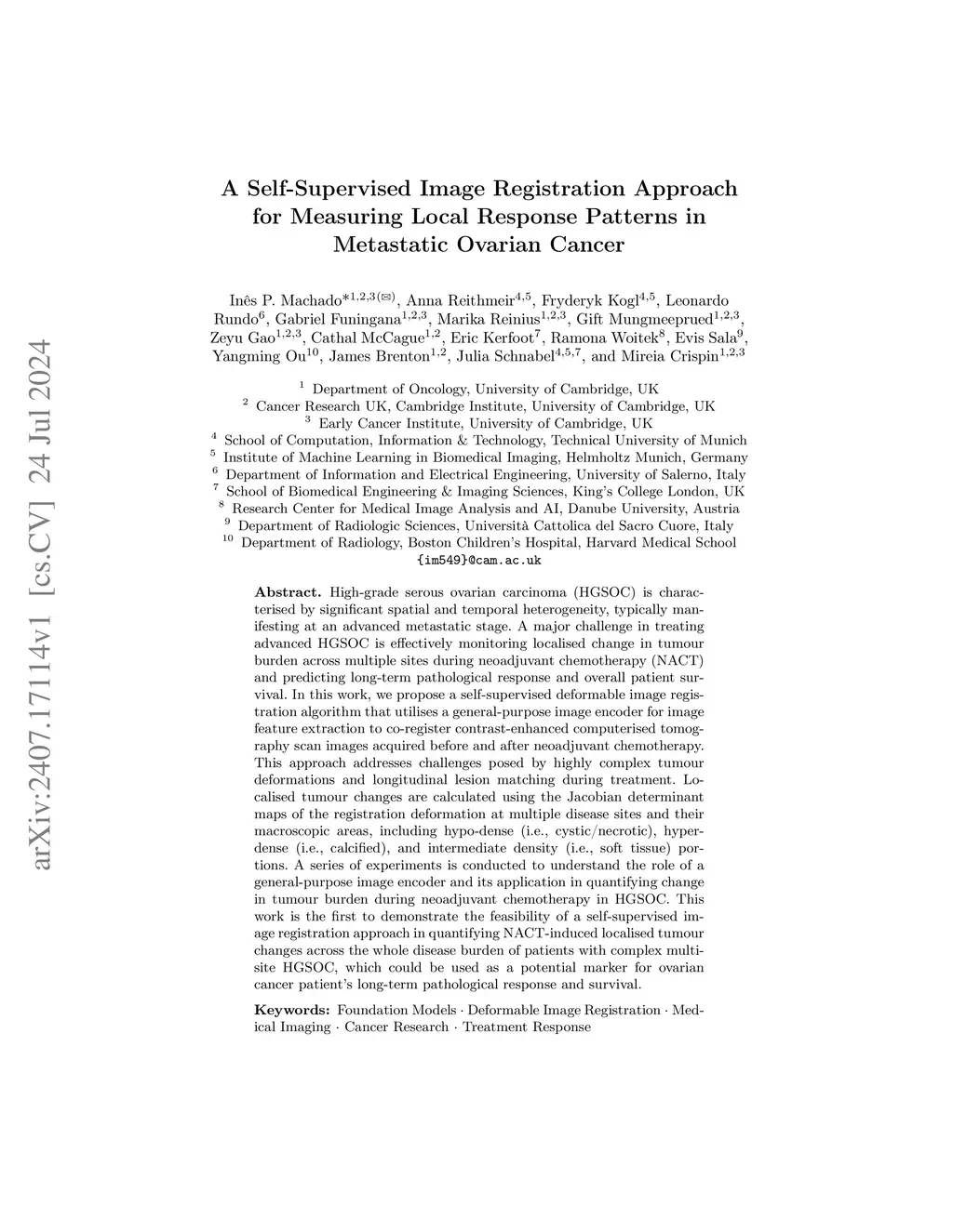 High-grade serous ovarian carcinoma (HGSOC) is characterised by significant spatial and temporal heterogeneity, typically manifesting at an advanced metastatic stage. A major challenge in treating advanced HGSOC is effectively monitoring localised change in tumour burden across multiple sites during neoadjuvant chemotherapy (NACT) and predicting long-term pathological response and overall patient survival. In this work, we propose a self-supervised deformable image registration algorithm that utilises a general-purpose image encoder for image feature extraction to co-register contrast-enhanced computerised tomography scan images acquired before and after neoadjuvant chemotherapy. This approach addresses challenges posed by highly complex tumour deformations and longitudinal lesion matching during treatment. Localised tumour changes are calculated using the Jacobian determinant maps of the registration deformation at multiple disease sites and their macroscopic areas, including hypo-dense (i.e., cystic/necrotic), hyper-dense (i.e., calcified), and intermediate density (i.e., soft tissue) portions. A series of experiments is conducted to understand the role of a general-purpose image encoder and its application in quantifying change in tumour burden during neoadjuvant chemotherapy in HGSOC. This work is the first to demonstrate the feasibility of a self-supervised image registration approach in quantifying NACT-induced localised tumour changes across the whole disease burden of patients with complex multi-site HGSOC, which could be used as a potential marker for ovarian cancer patient's long-term pathological response and survival.