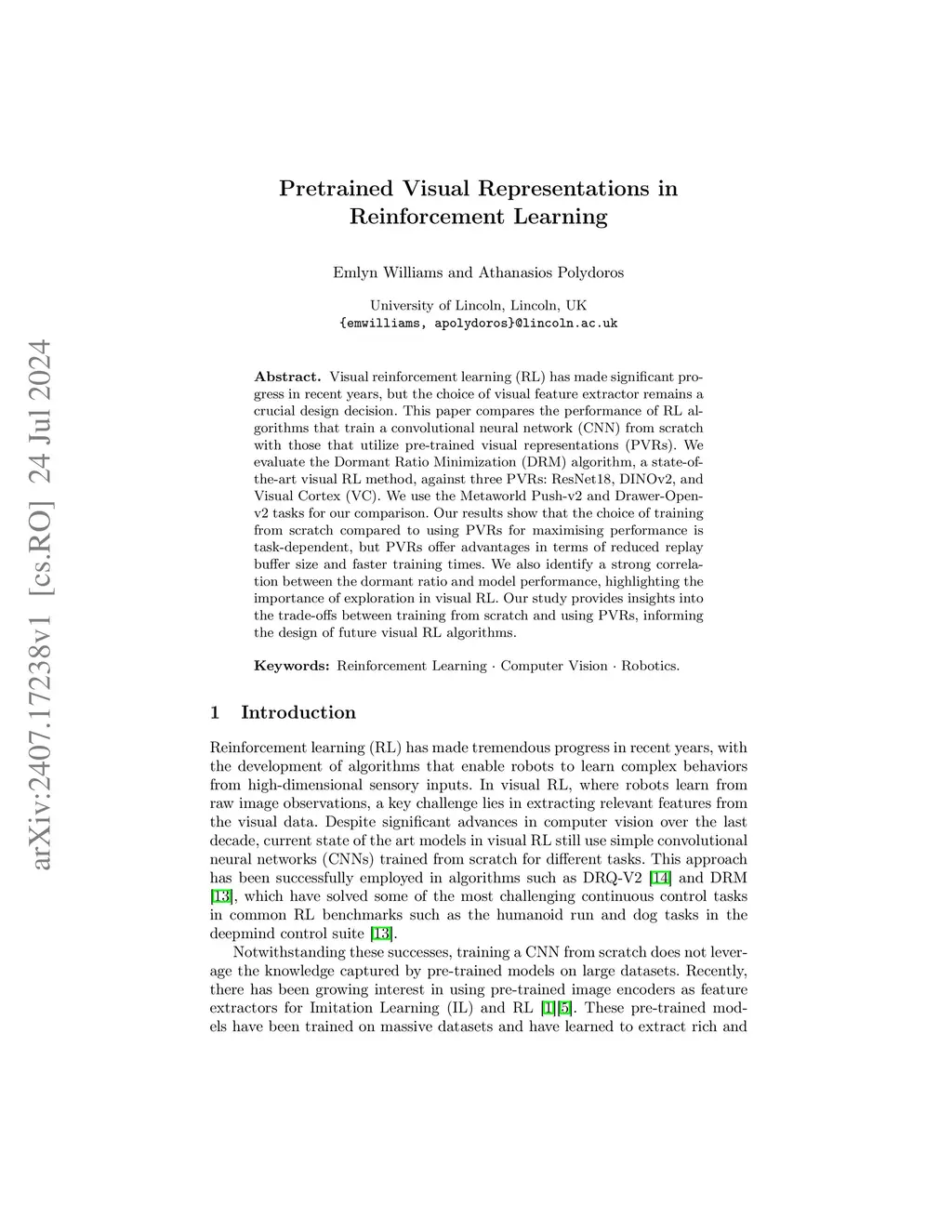 Visual reinforcement learning (RL) has made significant progress in recent years, but the choice of visual feature extractor remains a crucial design decision. This paper compares the performance of RL algorithms that train a convolutional neural network (CNN) from scratch with those that utilize pre-trained visual representations (PVRs). We evaluate the Dormant Ratio Minimization (DRM) algorithm, a state-of-the-art visual RL method, against three PVRs: ResNet18, DINOv2, and Visual Cortex (VC). We use the Metaworld Push-v2 and Drawer-Open-v2 tasks for our comparison. Our results show that the choice of training from scratch compared to using PVRs for maximising performance is task-dependent, but PVRs offer advantages in terms of reduced replay buffer size and faster training times. We also identify a strong correlation between the dormant ratio and model performance, highlighting the importance of exploration in visual RL. Our study provides insights into the trade-offs between training from scratch and using PVRs, informing the design of future visual RL algorithms.