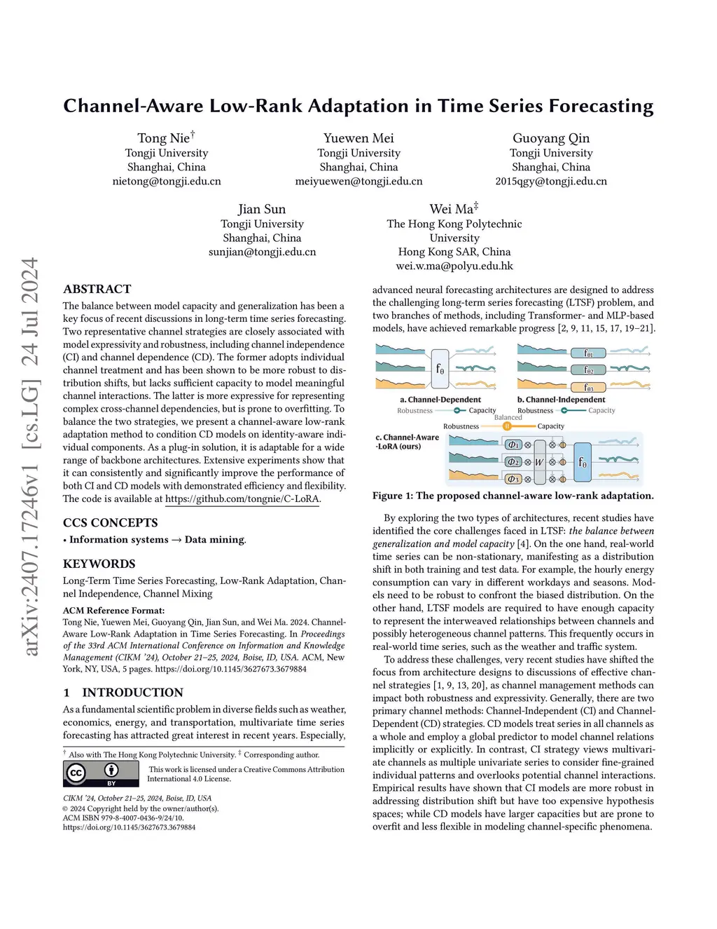 The balance between model capacity and generalization has been a key focus of recent discussions in long-term time series forecasting. Two representative channel strategies are closely associated with model expressivity and robustness, including channel independence (CI) and channel dependence (CD). The former adopts individual channel treatment and has been shown to be more robust to distribution shifts, but lacks sufficient capacity to model meaningful channel interactions. The latter is more expressive for representing complex cross-channel dependencies, but is prone to overfitting. To balance the two strategies, we present a channel-aware low-rank adaptation method to condition CD models on identity-aware individual components. As a plug-in solution, it is adaptable for a wide range of backbone architectures. Extensive experiments show that it can consistently and significantly improve the performance of both CI and CD models with demonstrated efficiency and flexibility. The code is available at https://github.com/tongnie/C-LoRA.
