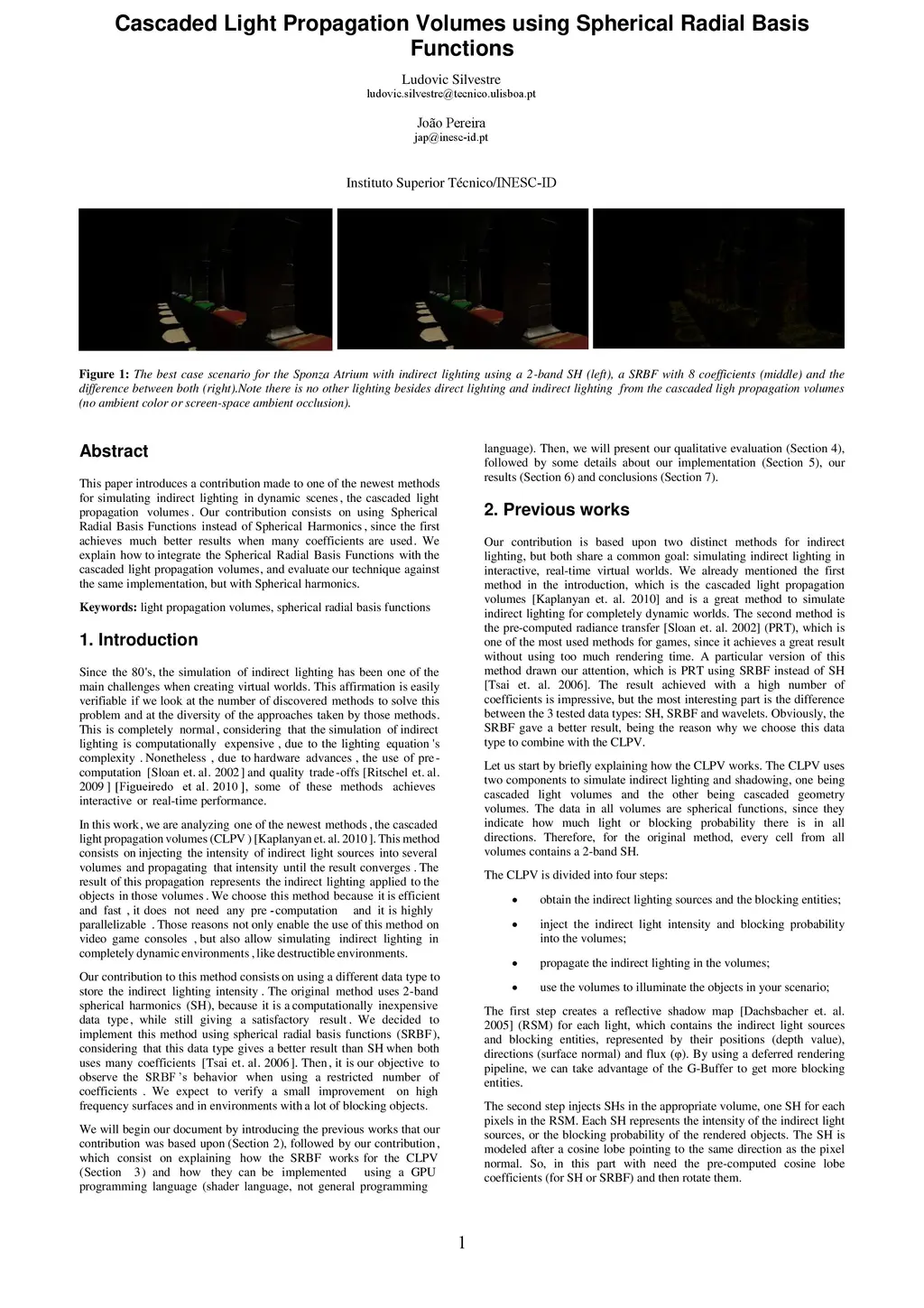 This paper introduces a contribution made to one of the newest methods for simulating indirect lighting in dynamic scenes , the cascaded light propagation volumes . Our contribution consists on using Spherical Radial Basis Functions instead of Spherical Harmonic, since the first achieves much better results when many coefficients are used. We explain how to integrate the Spherical Radial Basis Functions with the cascaded light propagation volumes, and evaluate our technique against the same implementation, but with Spherical harmonics.