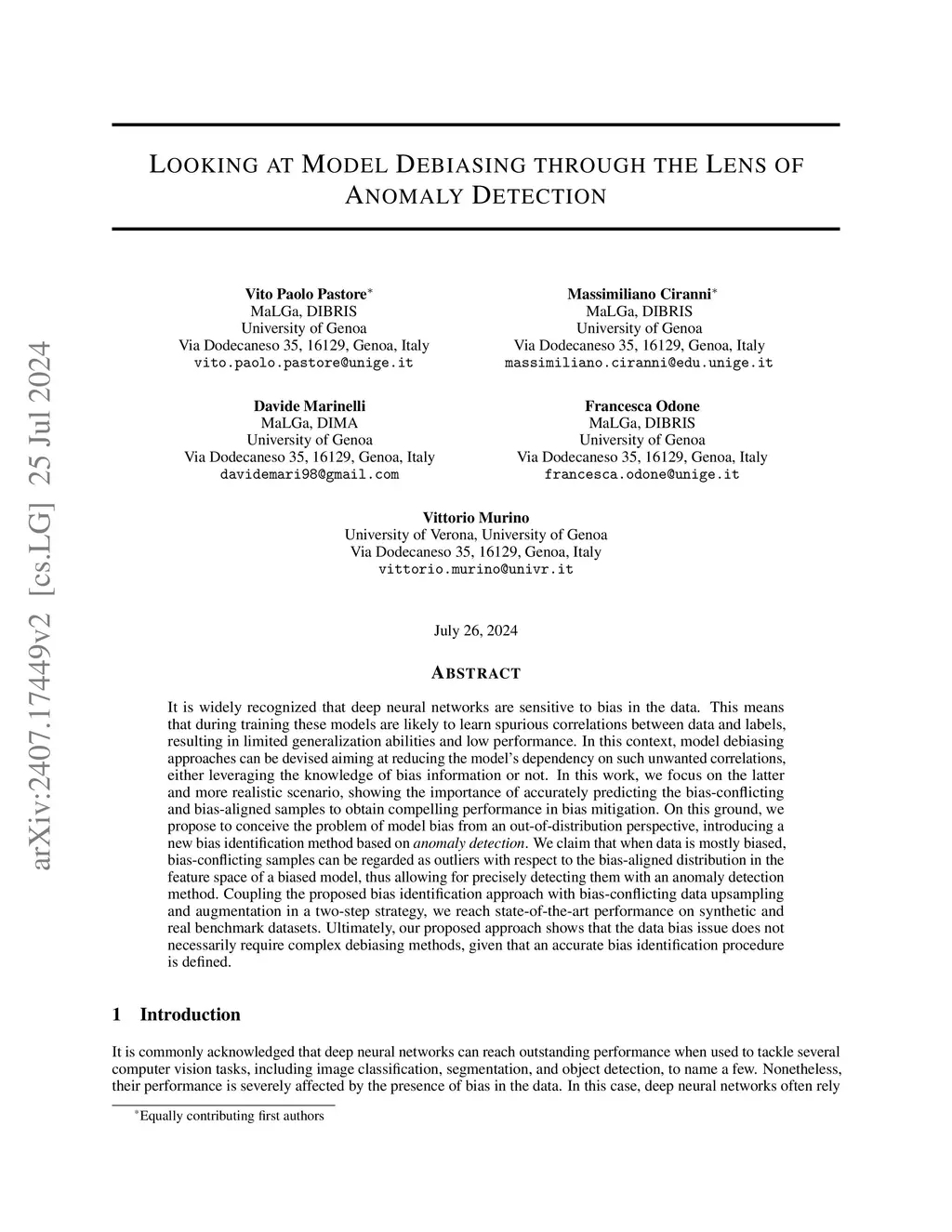 Looking at Model Debiasing through the Lens of Anomaly Detection