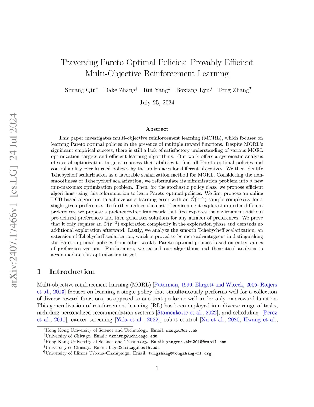 This paper investigates multi-objective reinforcement learning (MORL), which focuses on learning Pareto optimal policies in the presence of multiple reward functions. Despite MORL's significant empirical success, there is still a lack of satisfactory understanding of various MORL optimization targets and efficient learning algorithms. Our work offers a systematic analysis of several optimization targets to assess their abilities to find all Pareto optimal policies and controllability over learned policies by the preferences for different objectives. We then identify Tchebycheff scalarization as a favorable scalarization method for MORL. Considering the non-smoothness of Tchebycheff scalarization, we reformulate its minimization problem into a new min-max-max optimization problem. Then, for the stochastic policy class, we propose efficient algorithms using this reformulation to learn Pareto optimal policies. We first propose an online UCB-based algorithm to achieve an learning error with an sample complexity for a single given preference. To further reduce the cost of environment exploration under different preferences, we propose a preference-free framework that first explores the environment without pre-defined preferences and then generates solutions for any number of preferences. We prove that it only requires an exploration complexity in the exploration phase and demands no additional exploration afterward. Lastly, we analyze the smooth Tchebycheff scalarization, an extension of Tchebycheff scalarization, which is proved to be more advantageous in distinguishing the Pareto optimal policies from other weakly Pareto optimal policies based on entry values of preference vectors. Furthermore, we extend our algorithms and theoretical analysis to accommodate this optimization target.