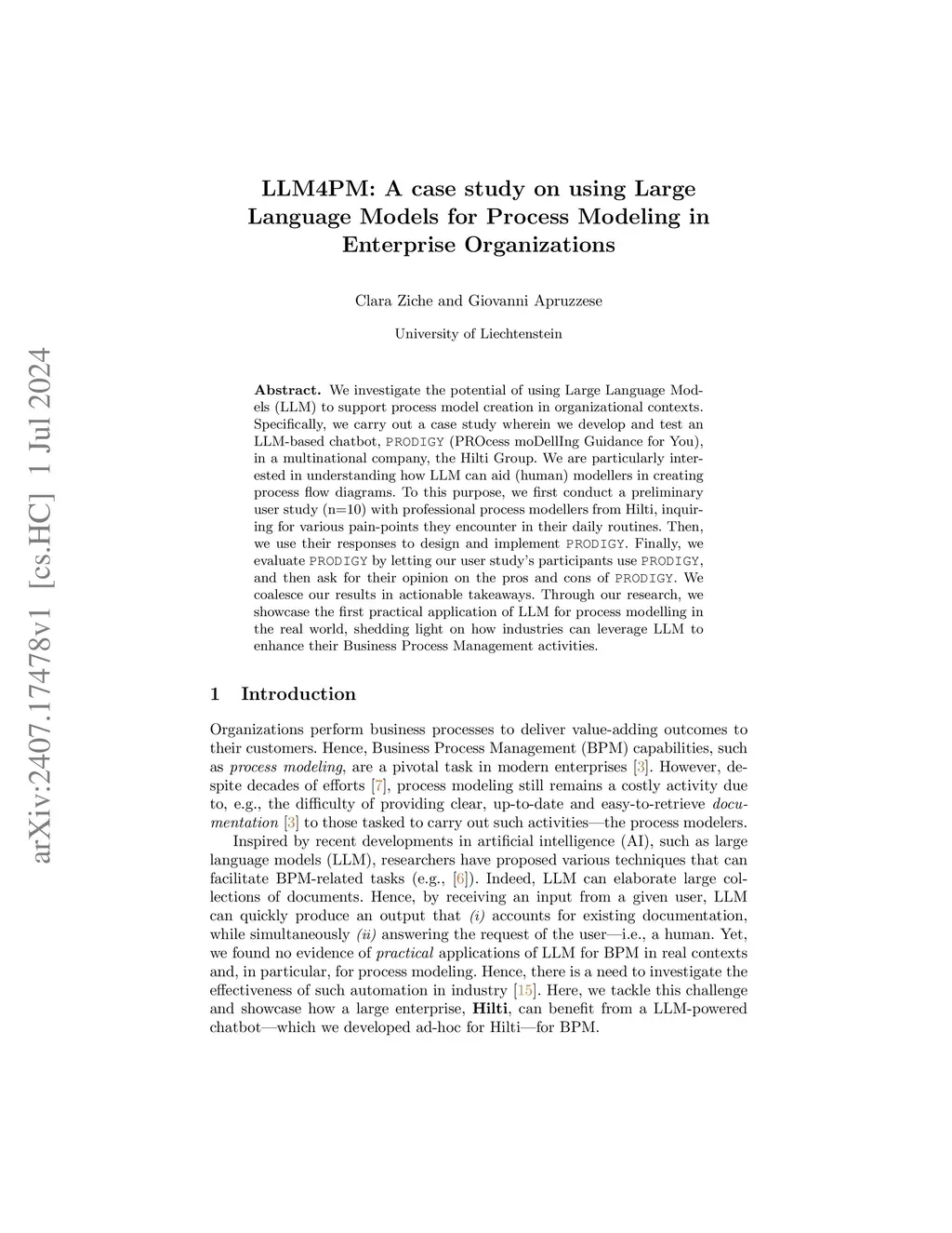 We investigate the potential of using Large Language Models (LLM) to support process model creation in organizational contexts. Specifically, we carry out a case study wherein we develop and test an LLM-based chatbot, PRODIGY (PROcess moDellIng Guidance for You), in a multinational company, the Hilti Group. We are particularly interested in understanding how LLM can aid (human) modellers in creating process flow diagrams. To this purpose, we first conduct a preliminary user study (n=10) with professional process modellers from Hilti, inquiring for various pain-points they encounter in their daily routines. Then, we use their responses to design and implement PRODIGY. Finally, we evaluate PRODIGY by letting our user study's participants use PRODIGY, and then ask for their opinion on the pros and cons of PRODIGY. We coalesce our results in actionable takeaways. Through our research, we showcase the first practical application of LLM for process modelling in the real world, shedding light on how industries can leverage LLM to enhance their Business Process Management activities.