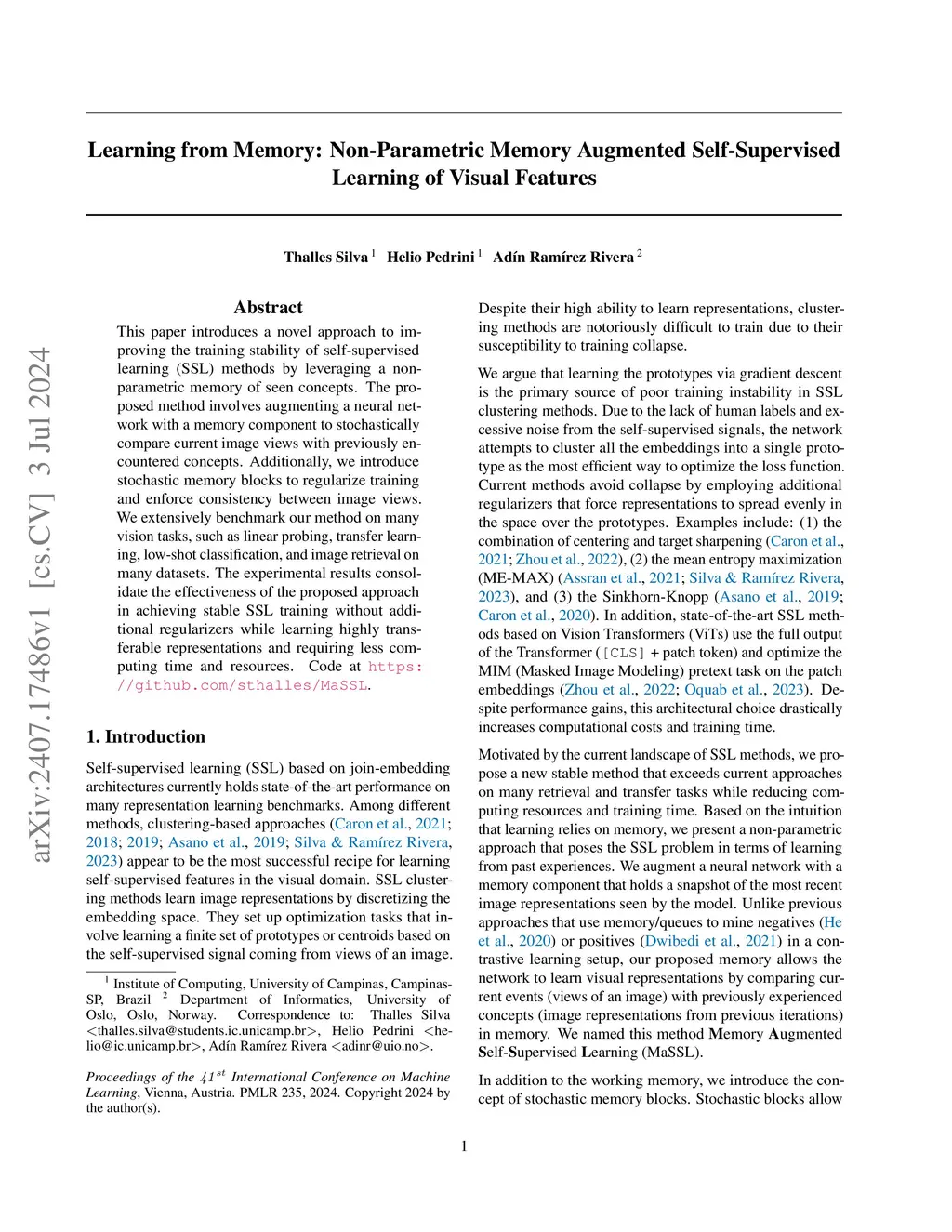 This paper introduces a novel approach to improving the training stability of self-supervised learning (SSL) methods by leveraging a non-parametric memory of seen concepts. The proposed method involves augmenting a neural network with a memory component to stochastically compare current image views with previously encountered concepts. Additionally, we introduce stochastic memory blocks to regularize training and enforce consistency between image views. We extensively benchmark our method on many vision tasks, such as linear probing, transfer learning, low-shot classification, and image retrieval on many datasets. The experimental results consolidate the effectiveness of the proposed approach in achieving stable SSL training without additional regularizers while learning highly transferable representations and requiring less computing time and resources.