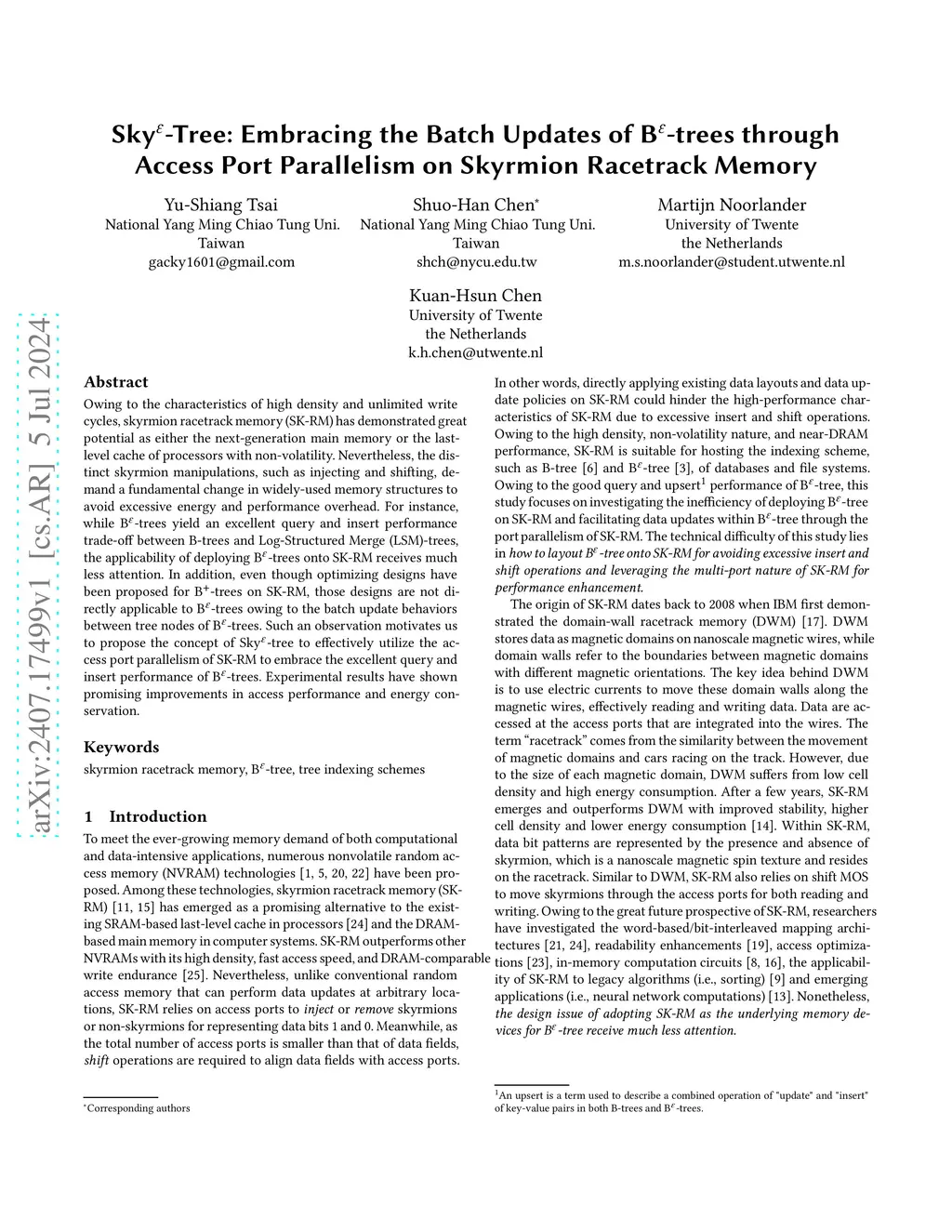 Owing to the characteristics of high density and unlimited write cycles, skyrmion racetrack memory (SK-RM) has demonstrated great potential as either the next-generation main memory or the last-level cache of processors with non-volatility. Nevertheless, the distinct skyrmion manipulations, such as injecting and shifting, demand a fundamental change in widely-used memory structures to avoid excessive energy and performance overhead. For instance, while B{\epsilon}-trees yield an excellent query and insert performance trade-off between B-trees and Log-Structured Merge (LSM)-trees, the applicability of deploying B{\epsilon}-trees onto SK-RM receives much less attention. In addition, even though optimizing designs have been proposed for B+-trees on SK-RM, those designs are not directly applicable to B{\epsilon}-trees owing to the batch update behaviors between tree nodes of B{\epsilon}-trees. Such an observation motivates us to propose the concept of Sky{\epsilon}-tree to effectively utilize the access port parallelism of SK-RM to embrace the excellent query and insert performance of B{\epsilon}-trees. Experimental results have shown promising improvements in access performance and energy conservation.