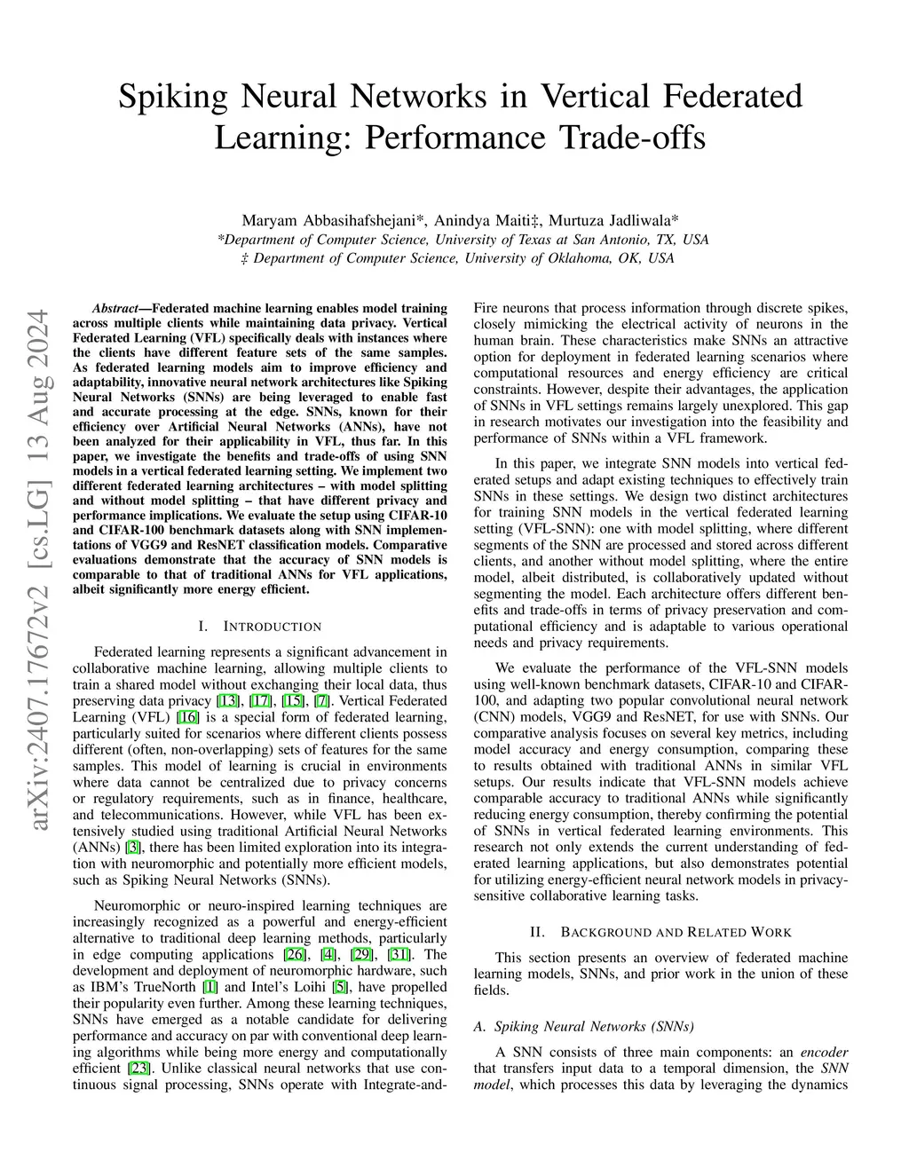 Federated machine learning enables model training across multiple clients while maintaining data privacy. Vertical Federated Learning (VFL) specifically deals with instances where the clients have different feature sets of the same samples. As federated learning models aim to improve efficiency and adaptability, innovative neural network architectures like Spiking Neural Networks (SNNs) are being leveraged to enable fast and accurate processing at the edge. SNNs, known for their efficiency over Artificial Neural Networks (ANNs), have not been analyzed for their applicability in VFL, thus far. In this paper, we investigate the benefits and trade-offs of using SNN models in a vertical federated learning setting. We implement two different federated learning architectures -- with model splitting and without model splitting -- that have different privacy and performance implications. We evaluate the setup using CIFAR-10 and CIFAR-100 benchmark datasets along with SNN implementations of VGG9 and ResNET classification models. Comparative evaluations demonstrate that the accuracy of SNN models is comparable to that of traditional ANNs for VFL applications, albeit significantly more energy efficient.