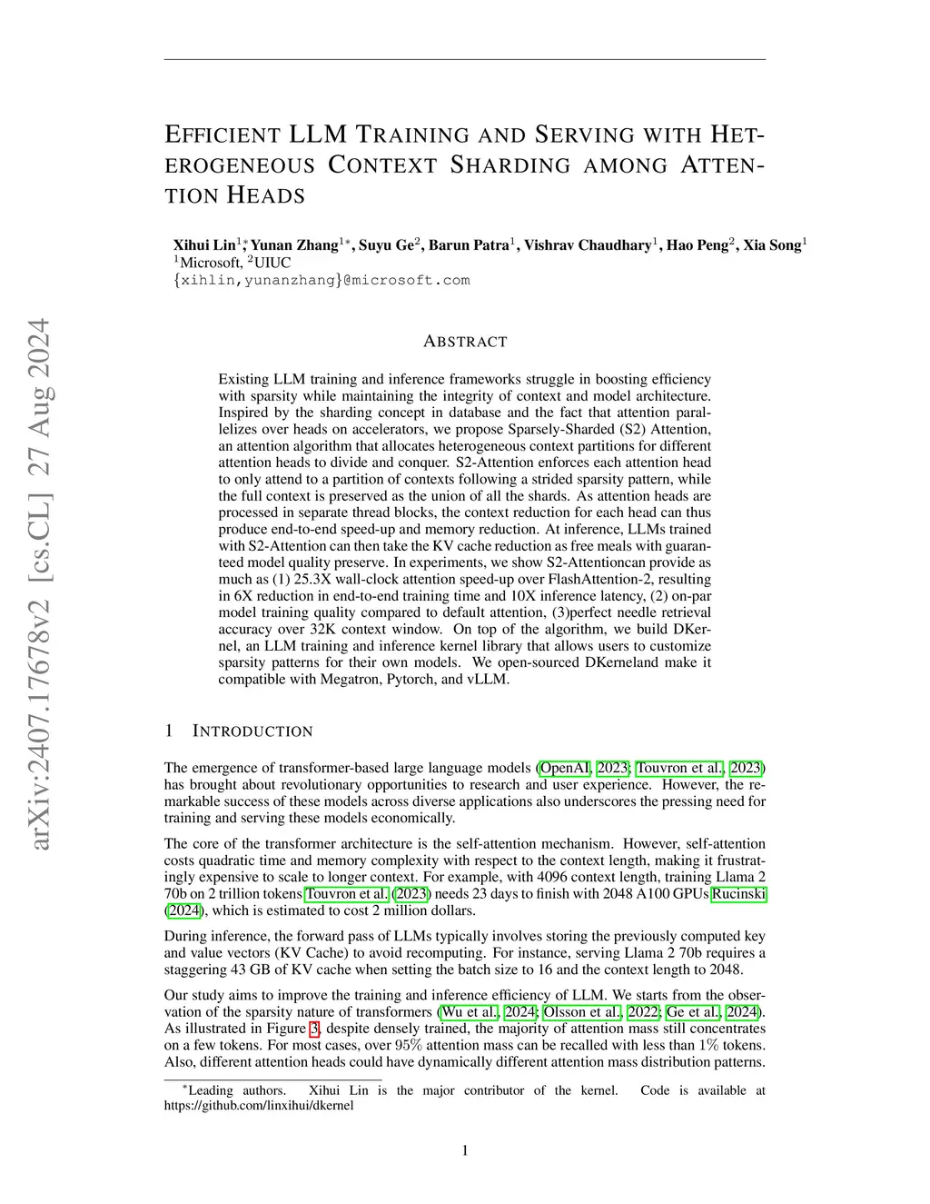 Existing LLM training and inference frameworks struggle in boosting efficiency with sparsity while maintaining the integrity of context and model architecture. Inspired by the sharding concept in database and the fact that attention parallelizes over heads on accelerators, we propose Sparsely-Sharded (S2) Attention, an attention algorithm that allocates heterogeneous context partitions for different attention heads to divide and conquer. S2-Attention enforces each attention head to only attend to a partition of contexts following a strided sparsity pattern, while the full context is preserved as the union of all the shards. As attention heads are processed in separate thread blocks, the context reduction for each head can thus produce end-to-end speed-up and memory reduction. At inference, LLMs trained with S2-Attention can then take the KV cache reduction as free meals with guaranteed model quality preserve. In experiments, we show S2-Attentioncan provide as much as (1) 25.3X wall-clock attention speed-up over FlashAttention-2, resulting in 6X reduction in end-to-end training time and 10X inference latency, (2) on-par model training quality compared to default attention, (3)perfect needle retrieval accuracy over 32K context window. On top of the algorithm, we build DKernel, an LLM training and inference kernel library that allows users to customize sparsity patterns for their own models. We open-sourced DKerneland make it compatible with Megatron, Pytorch, and vLLM.