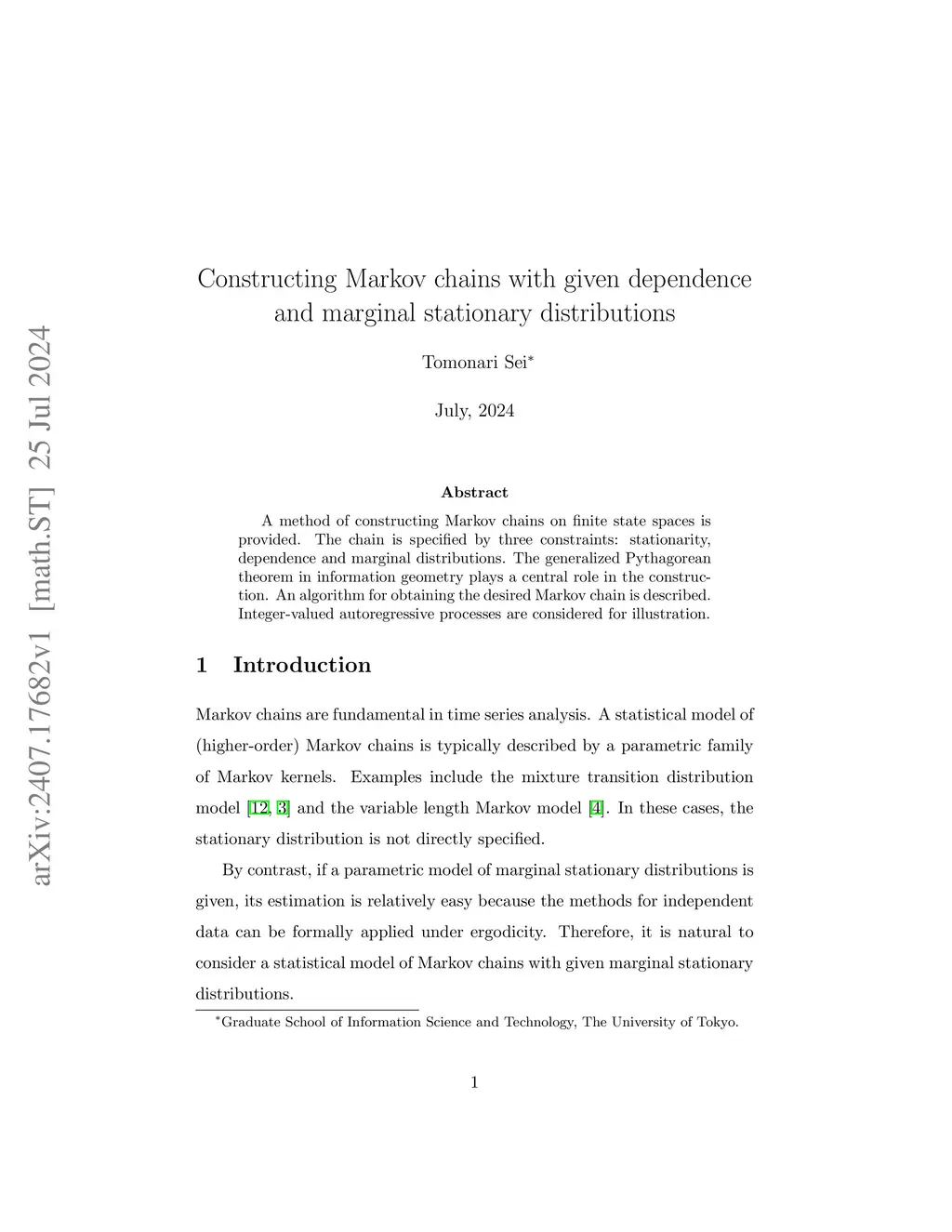 A method of constructing Markov chains on finite state spaces is provided. The chain is specified by three constraints: stationarity, dependence and marginal distributions. The generalized Pythagorean theorem in information geometry plays a central role in the construction. An algorithm for obtaining the desired Markov chain is described. Integer-valued autoregressive processes are considered for illustration.
