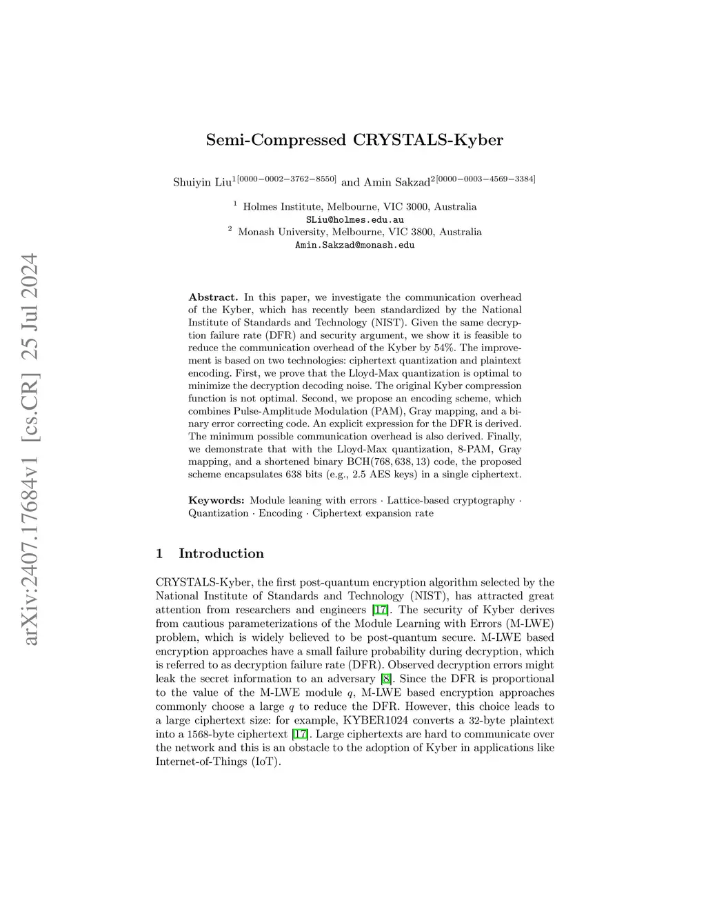 In this paper, we investigate the communication overhead of the Kyber, which has recently been standardized by the National Institute of Standards and Technology (NIST). Given the same decryption failure rate (DFR) and security argument, we show it is feasible to reduce the communication overhead of the Kyber by 54%. The improvement is based on two technologies: ciphertext quantization and plaintext encoding. First, we prove that the Lloyd-Max quantization is optimal to minimize the decryption decoding noise. The original Kyber compression function is not optimal. Second, we propose an encoding scheme, which combines Pulse-Amplitude Modulation (PAM), Gray mapping, and a binary error correcting code. An explicit expression for the DFR is derived. The minimum possible communication overhead is also derived. Finally, we demonstrate that with the Lloyd-Max quantization, 8-PAM, Gray mapping, and a shortened binary BCH(768,638,13) code, the proposed scheme encapsulates 638 bits (e.g., 2.5 AES keys) in a single ciphertext.