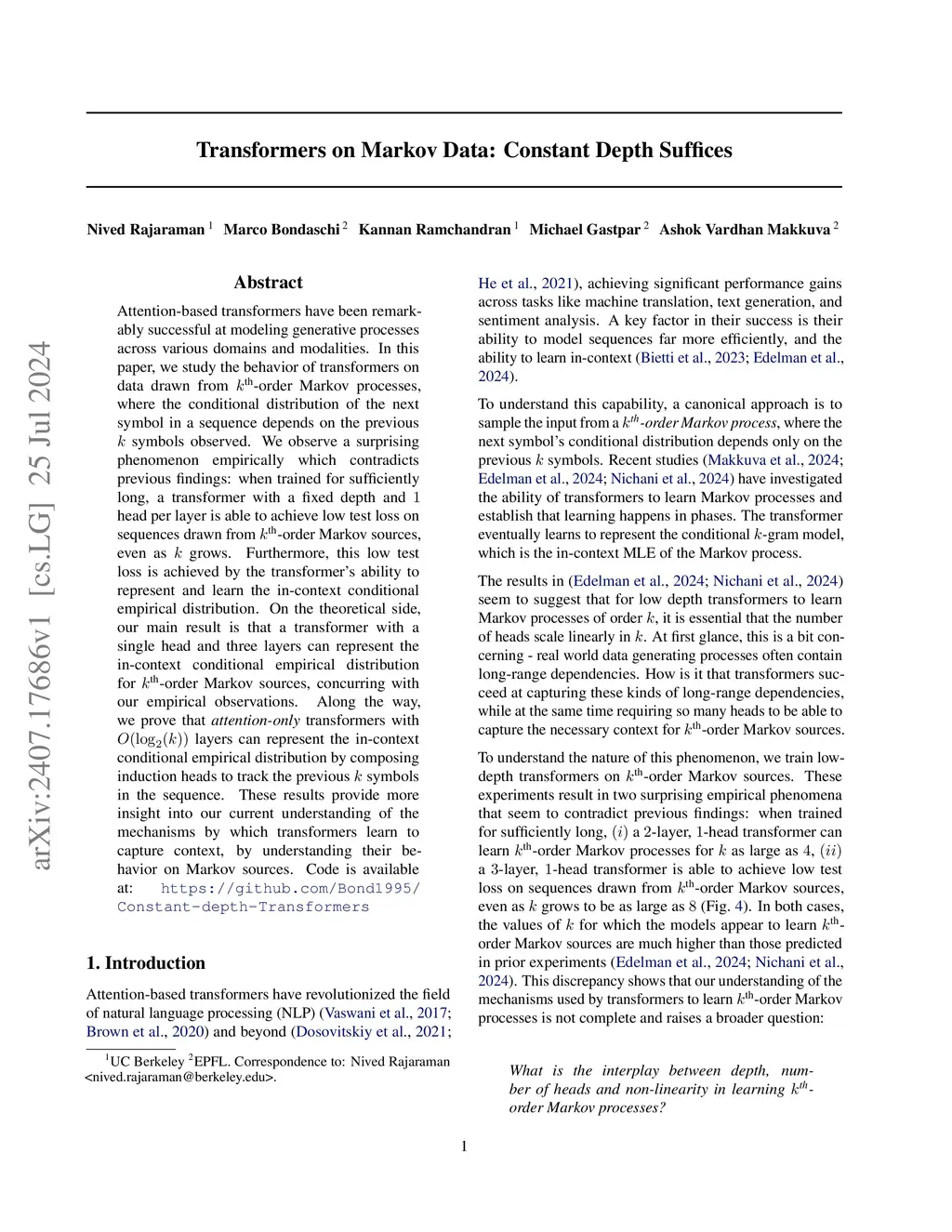 Attention-based transformers have been remarkably successful at modeling generative processes across various domains and modalities. In this paper, we study the behavior of transformers on data drawn from \kth Markov processes, where the conditional distribution of the next symbol in a sequence depends on the previous symbols observed. We observe a surprising phenomenon empirically which contradicts previous findings: when trained for sufficiently long, a transformer with a fixed depth and head per layer is able to achieve low test loss on sequences drawn from \kth Markov sources, even as grows. Furthermore, this low test loss is achieved by the transformer's ability to represent and learn the in-context conditional empirical distribution. On the theoretical side, our main result is that a transformer with a single head and three layers can represent the in-context conditional empirical distribution for \kth Markov sources, concurring with our empirical observations. Along the way, we prove that \textit{attention-only} transformers with layers can represent the in-context conditional empirical distribution by composing induction heads to track the previous symbols in the sequence. These results provide more insight into our current understanding of the mechanisms by which transformers learn to capture context, by understanding their behavior on Markov sources.