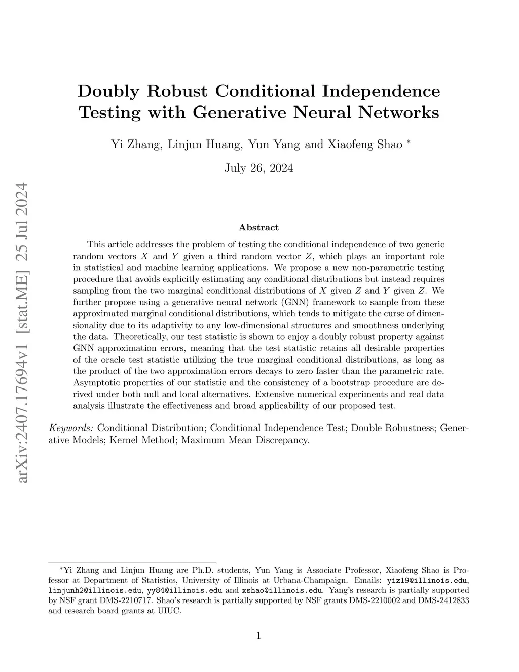 This article addresses the problem of testing the conditional independence of two generic random vectors and given a third random vector , which plays an important role in statistical and machine learning applications. We propose a new non-parametric testing procedure that avoids explicitly estimating any conditional distributions but instead requires sampling from the two marginal conditional distributions of given and given . We further propose using a generative neural network (GNN) framework to sample from these approximated marginal conditional distributions, which tends to mitigate the curse of dimensionality due to its adaptivity to any low-dimensional structures and smoothness underlying the data. Theoretically, our test statistic is shown to enjoy a doubly robust property against GNN approximation errors, meaning that the test statistic retains all desirable properties of the oracle test statistic utilizing the true marginal conditional distributions, as long as the product of the two approximation errors decays to zero faster than the parametric rate. Asymptotic properties of our statistic and the consistency of a bootstrap procedure are derived under both null and local alternatives. Extensive numerical experiments and real data analysis illustrate the effectiveness and broad applicability of our proposed test.