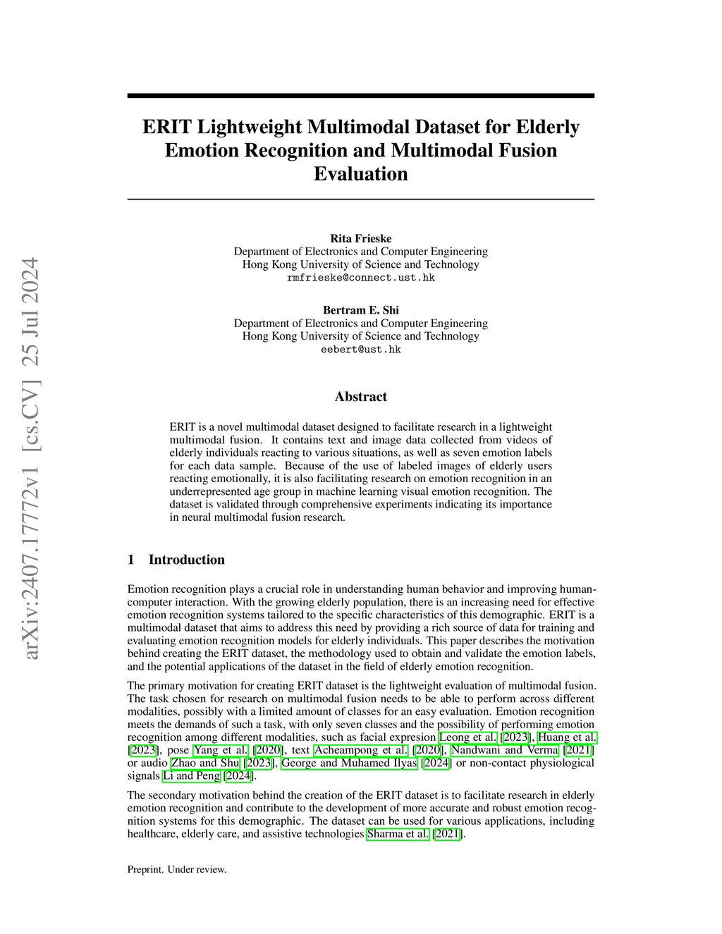 ERIT Lightweight Multimodal Dataset for Elderly Emotion Recognition and