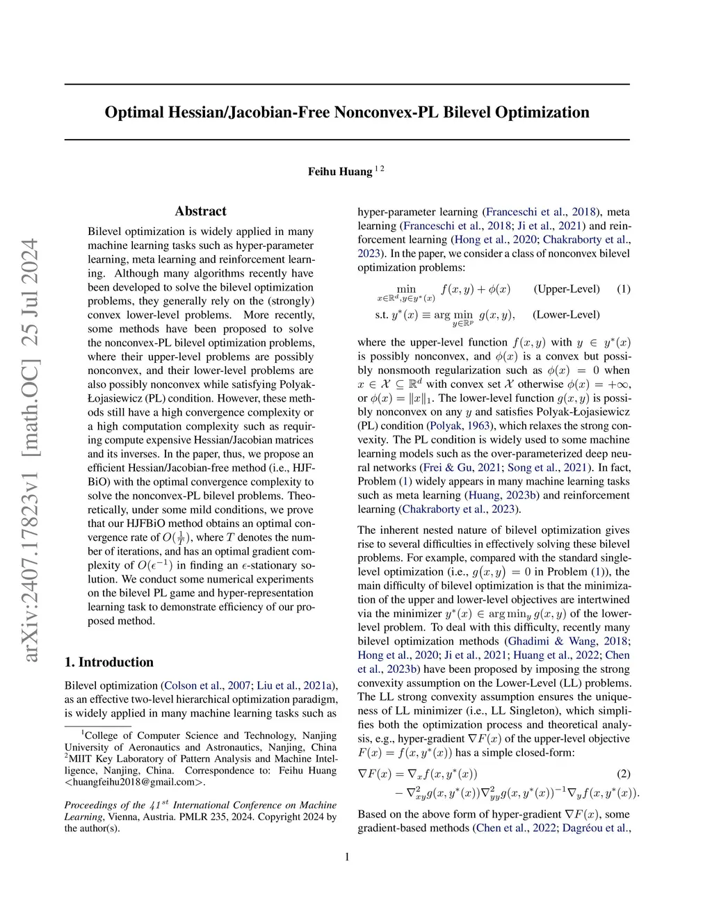 Bilevel optimization is widely applied in many machine learning tasks such as hyper-parameter learning, meta learning and reinforcement learning. Although many algorithms recently have been developed to solve the bilevel optimization problems, they generally rely on the (strongly) convex lower-level problems. More recently, some methods have been proposed to solve the nonconvex-PL bilevel optimization problems, where their upper-level problems are possibly nonconvex, and their lower-level problems are also possibly nonconvex while satisfying Polyak-{\L}ojasiewicz (PL) condition. However, these methods still have a high convergence complexity or a high computation complexity such as requiring compute expensive Hessian/Jacobian matrices and its inverses. In the paper, thus, we propose an efficient Hessian/Jacobian-free method (i.e., HJFBiO) with the optimal convergence complexity to solve the nonconvex-PL bilevel problems. Theoretically, under some mild conditions, we prove that our HJFBiO method obtains an optimal convergence rate of , where denotes the number of iterations, and has an optimal gradient complexity of in finding an -stationary solution. We conduct some numerical experiments on the bilevel PL game and hyper-representation learning task to demonstrate efficiency of our proposed method.