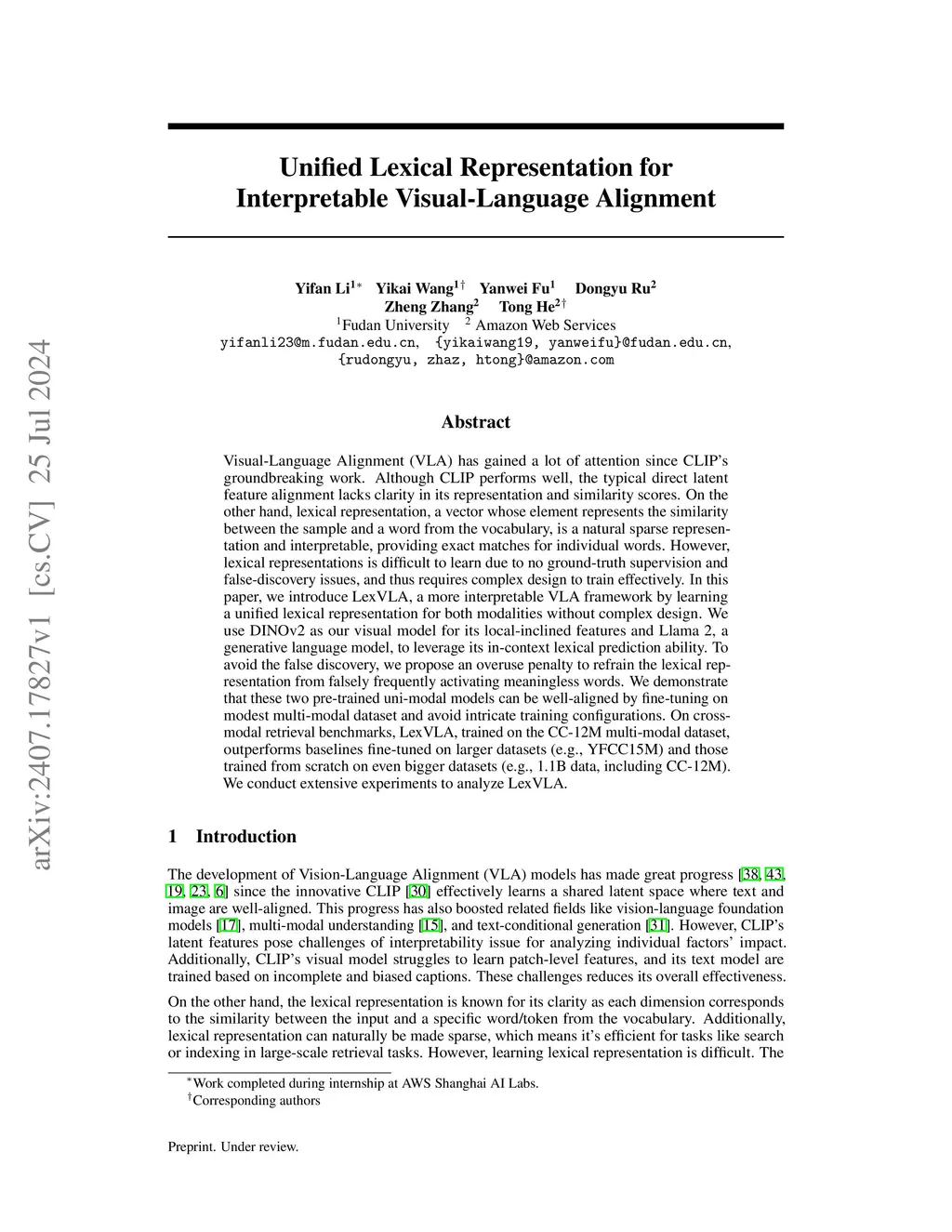 Visual-Language Alignment (VLA) has gained a lot of attention since CLIP's groundbreaking work. Although CLIP performs well, the typical direct latent feature alignment lacks clarity in its representation and similarity scores. On the other hand, lexical representation, a vector whose element represents the similarity between the sample and a word from the vocabulary, is a natural sparse representation and interpretable, providing exact matches for individual words. However, lexical representations is difficult to learn due to no ground-truth supervision and false-discovery issues, and thus requires complex design to train effectively. In this paper, we introduce LexVLA, a more interpretable VLA framework by learning a unified lexical representation for both modalities without complex design. We use DINOv2 as our visual model for its local-inclined features and Llama 2, a generative language model, to leverage its in-context lexical prediction ability. To avoid the false discovery, we propose an overuse penalty to refrain the lexical representation from falsely frequently activating meaningless words. We demonstrate that these two pre-trained uni-modal models can be well-aligned by fine-tuning on modest multi-modal dataset and avoid intricate training configurations. On cross-modal retrieval benchmarks, LexVLA, trained on the CC-12M multi-modal dataset, outperforms baselines fine-tuned on larger datasets (e.g., YFCC15M) and those trained from scratch on even bigger datasets (e.g., 1.1B data, including CC-12M). We conduct extensive experiments to analyze LexVLA.