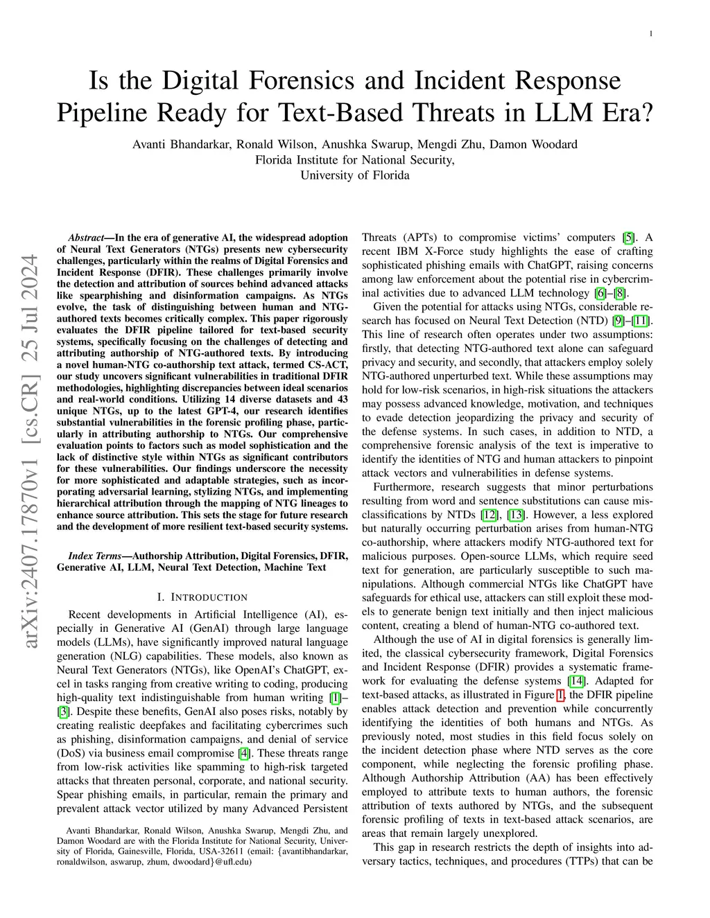 In the era of generative AI, the widespread adoption of Neural Text Generators (NTGs) presents new cybersecurity challenges, particularly within the realms of Digital Forensics and Incident Response (DFIR). These challenges primarily involve the detection and attribution of sources behind advanced attacks like spearphishing and disinformation campaigns. As NTGs evolve, the task of distinguishing between human and NTG-authored texts becomes critically complex. This paper rigorously evaluates the DFIR pipeline tailored for text-based security systems, specifically focusing on the challenges of detecting and attributing authorship of NTG-authored texts. By introducing a novel human-NTG co-authorship text attack, termed CS-ACT, our study uncovers significant vulnerabilities in traditional DFIR methodologies, highlighting discrepancies between ideal scenarios and real-world conditions. Utilizing 14 diverse datasets and 43 unique NTGs, up to the latest GPT-4, our research identifies substantial vulnerabilities in the forensic profiling phase, particularly in attributing authorship to NTGs. Our comprehensive evaluation points to factors such as model sophistication and the lack of distinctive style within NTGs as significant contributors for these vulnerabilities. Our findings underscore the necessity for more sophisticated and adaptable strategies, such as incorporating adversarial learning, stylizing NTGs, and implementing hierarchical attribution through the mapping of NTG lineages to enhance source attribution. This sets the stage for future research and the development of more resilient text-based security systems.