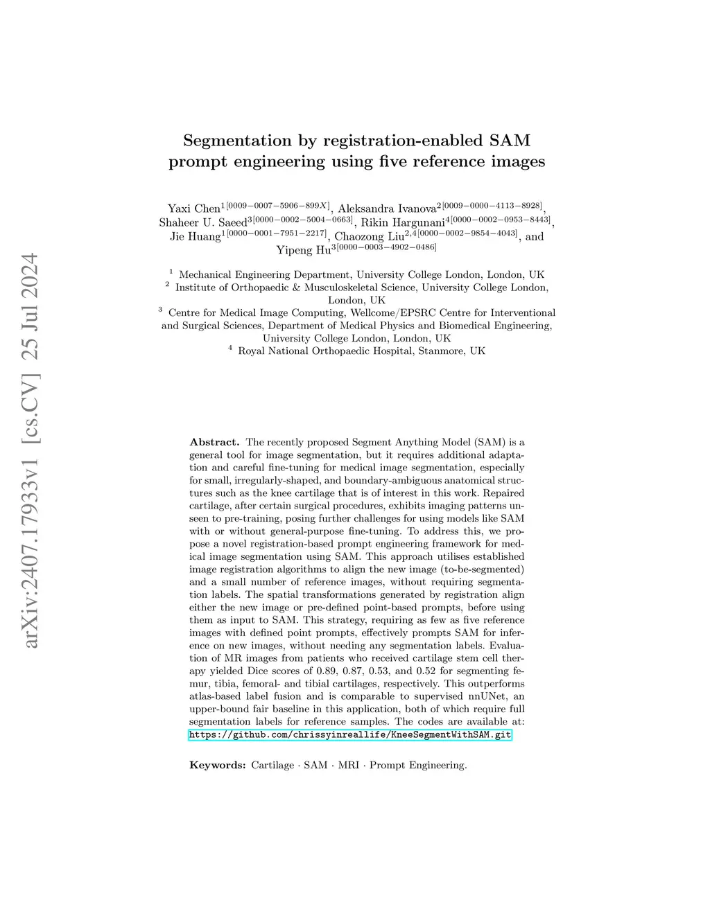 The recently proposed Segment Anything Model (SAM) is a general tool for image segmentation, but it requires additional adaptation and careful fine-tuning for medical image segmentation, especially for small, irregularly-shaped, and boundary-ambiguous anatomical structures such as the knee cartilage that is of interest in this work. Repaired cartilage, after certain surgical procedures, exhibits imaging patterns unseen to pre-training, posing further challenges for using models like SAM with or without general-purpose fine-tuning. To address this, we propose a novel registration-based prompt engineering framework for medical image segmentation using SAM. This approach utilises established image registration algorithms to align the new image (to-be-segmented) and a small number of reference images, without requiring segmentation labels. The spatial transformations generated by registration align either the new image or pre-defined point-based prompts, before using them as input to SAM. This strategy, requiring as few as five reference images with defined point prompts, effectively prompts SAM for inference on new images, without needing any segmentation labels. Evaluation of MR images from patients who received cartilage stem cell therapy yielded Dice scores of 0.89, 0.87, 0.53, and 0.52 for segmenting femur, tibia, femoral- and tibial cartilages, respectively. This outperforms atlas-based label fusion and is comparable to supervised nnUNet, an upper-bound fair baseline in this application, both of which require full segmentation labels for reference samples. The codes are available at: https://github.com/chrissyinreallife/KneeSegmentWithSAM.git