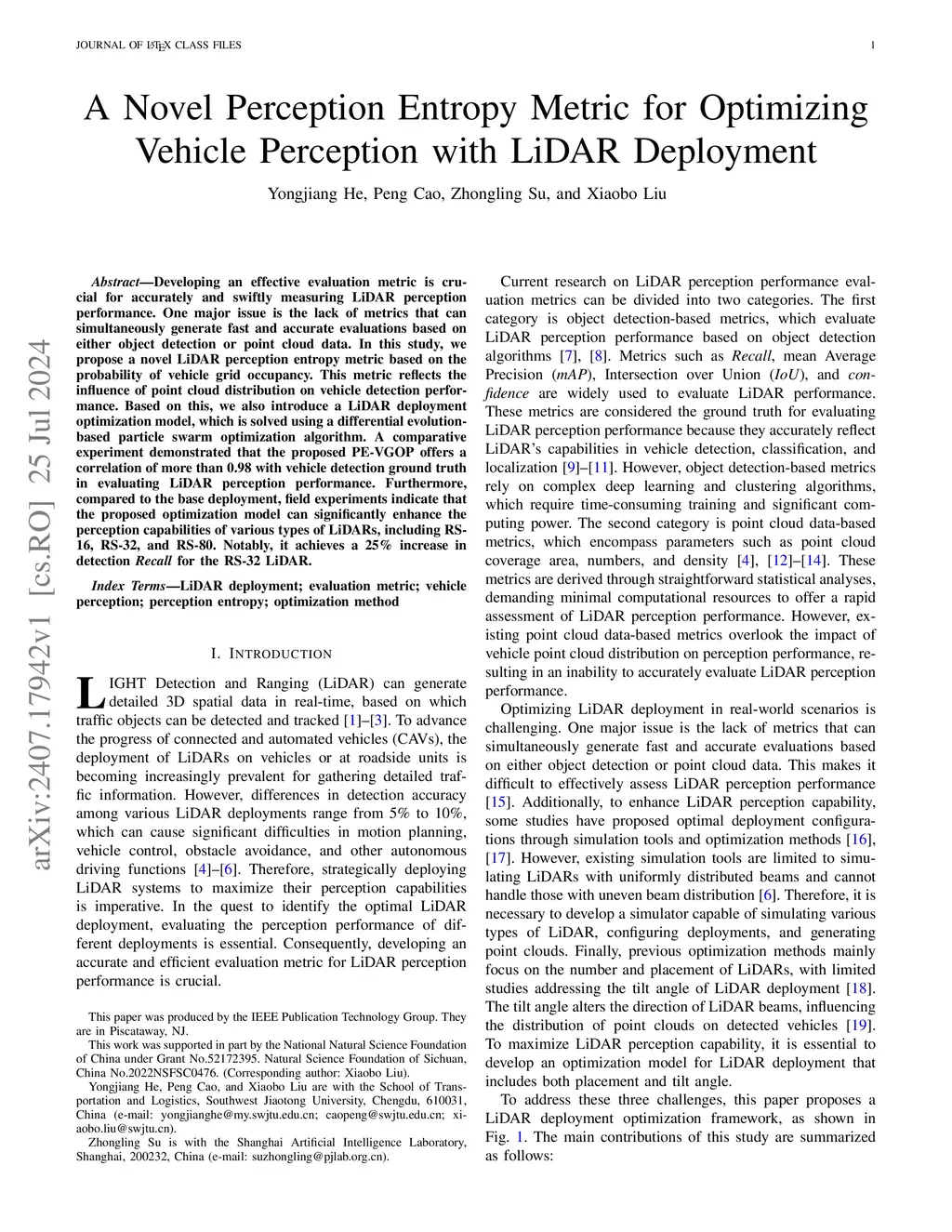 Developing an effective evaluation metric is crucial for accurately and swiftly measuring LiDAR perception performance. One major issue is the lack of metrics that can simultaneously generate fast and accurate evaluations based on either object detection or point cloud data. In this study, we propose a novel LiDAR perception entropy metric based on the probability of vehicle grid occupancy. This metric reflects the influence of point cloud distribution on vehicle detection performance. Based on this, we also introduce a LiDAR deployment optimization model, which is solved using a differential evolution-based particle swarm optimization algorithm. A comparative experiment demonstrated that the proposed PE-VGOP offers a correlation of more than 0.98 with vehicle detection ground truth in evaluating LiDAR perception performance. Furthermore, compared to the base deployment, field experiments indicate that the proposed optimization model can significantly enhance the perception capabilities of various types of LiDARs, including RS-16, RS-32, and RS-80. Notably, it achieves a 25% increase in detection Recall for the RS-32 LiDAR.