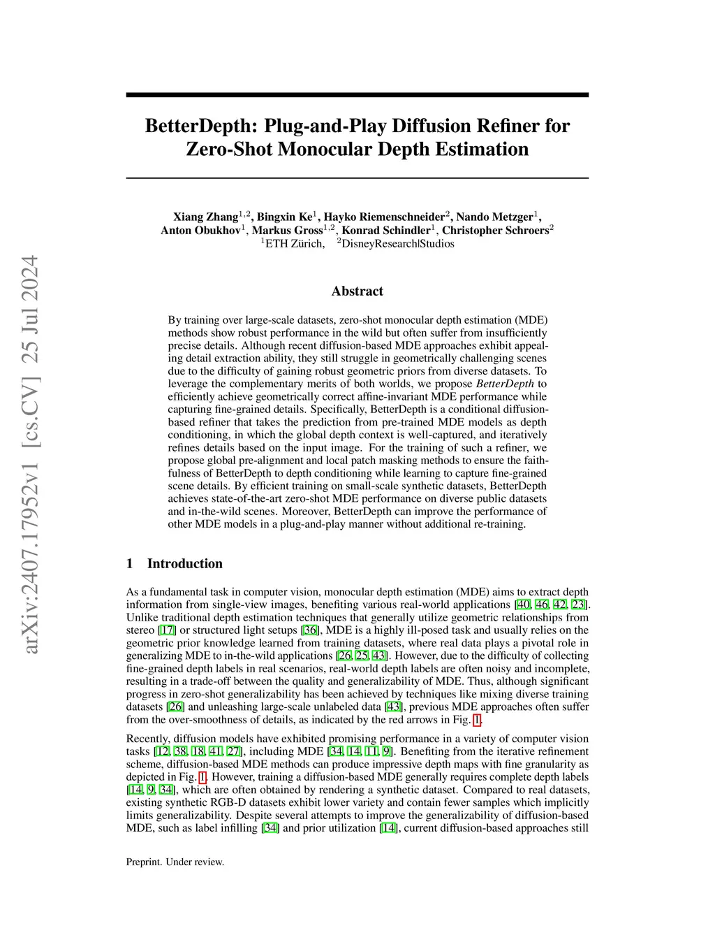 By training over large-scale datasets, zero-shot monocular depth estimation (MDE) methods show robust performance in the wild but often suffer from insufficiently precise details. Although recent diffusion-based MDE approaches exhibit appealing detail extraction ability, they still struggle in geometrically challenging scenes due to the difficulty of gaining robust geometric priors from diverse datasets. To leverage the complementary merits of both worlds, we propose BetterDepth to efficiently achieve geometrically correct affine-invariant MDE performance while capturing fine-grained details. Specifically, BetterDepth is a conditional diffusion-based refiner that takes the prediction from pre-trained MDE models as depth conditioning, in which the global depth context is well-captured, and iteratively refines details based on the input image. For the training of such a refiner, we propose global pre-alignment and local patch masking methods to ensure the faithfulness of BetterDepth to depth conditioning while learning to capture fine-grained scene details. By efficient training on small-scale synthetic datasets, BetterDepth achieves state-of-the-art zero-shot MDE performance on diverse public datasets and in-the-wild scenes. Moreover, BetterDepth can improve the performance of other MDE models in a plug-and-play manner without additional re-training.
