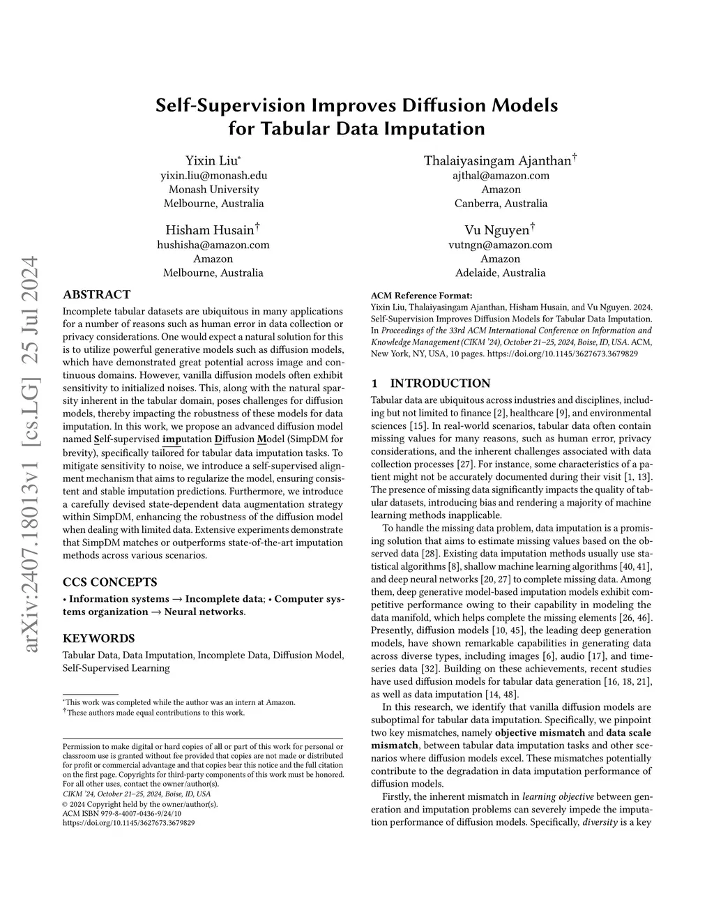 The ubiquity of missing data has sparked considerable attention and focus on tabular data imputation methods. Diffusion models, recognized as the cutting-edge technique for data generation, demonstrate significant potential in tabular data imputation tasks. However, in pursuit of diversity, vanilla diffusion models often exhibit sensitivity to initialized noises, which hinders the models from generating stable and accurate imputation results. Additionally, the sparsity inherent in tabular data poses challenges for diffusion models in accurately modeling the data manifold, impacting the robustness of these models for data imputation. To tackle these challenges, this paper introduces an advanced diffusion model named Self-supervised imputation Diffusion Model (SimpDM for brevity), specifically tailored for tabular data imputation tasks. To mitigate sensitivity to noise, we introduce a self-supervised alignment mechanism that aims to regularize the model, ensuring consistent and stable imputation predictions. Furthermore, we introduce a carefully devised state-dependent data augmentation strategy within SimpDM, enhancing the robustness of the diffusion model when dealing with limited data. Extensive experiments demonstrate that SimpDM matches or outperforms state-of-the-art imputation methods across various scenarios.
