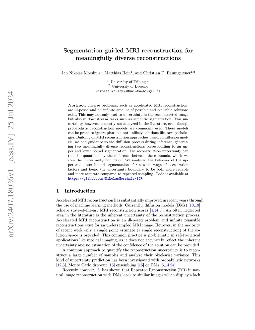 Inverse problems, such as accelerated MRI reconstruction, are ill-posed and an infinite amount of possible and plausible solutions exist. This may not only lead to uncertainty in the reconstructed image but also in downstream tasks such as semantic segmentation. This uncertainty, however, is mostly not analyzed in the literature, even though probabilistic reconstruction models are commonly used. These models can be prone to ignore plausible but unlikely solutions like rare pathologies. Building on MRI reconstruction approaches based on diffusion models, we add guidance to the diffusion process during inference, generating two meaningfully diverse reconstructions corresponding to an upper and lower bound segmentation. The reconstruction uncertainty can then be quantified by the difference between these bounds, which we coin the úncertainty boundary'. We analyzed the behavior of the upper and lower bound segmentations for a wide range of acceleration factors and found the uncertainty boundary to be both more reliable and more accurate compared to repeated sampling. Code is available at https://github.com/NikolasMorshuis/SGR