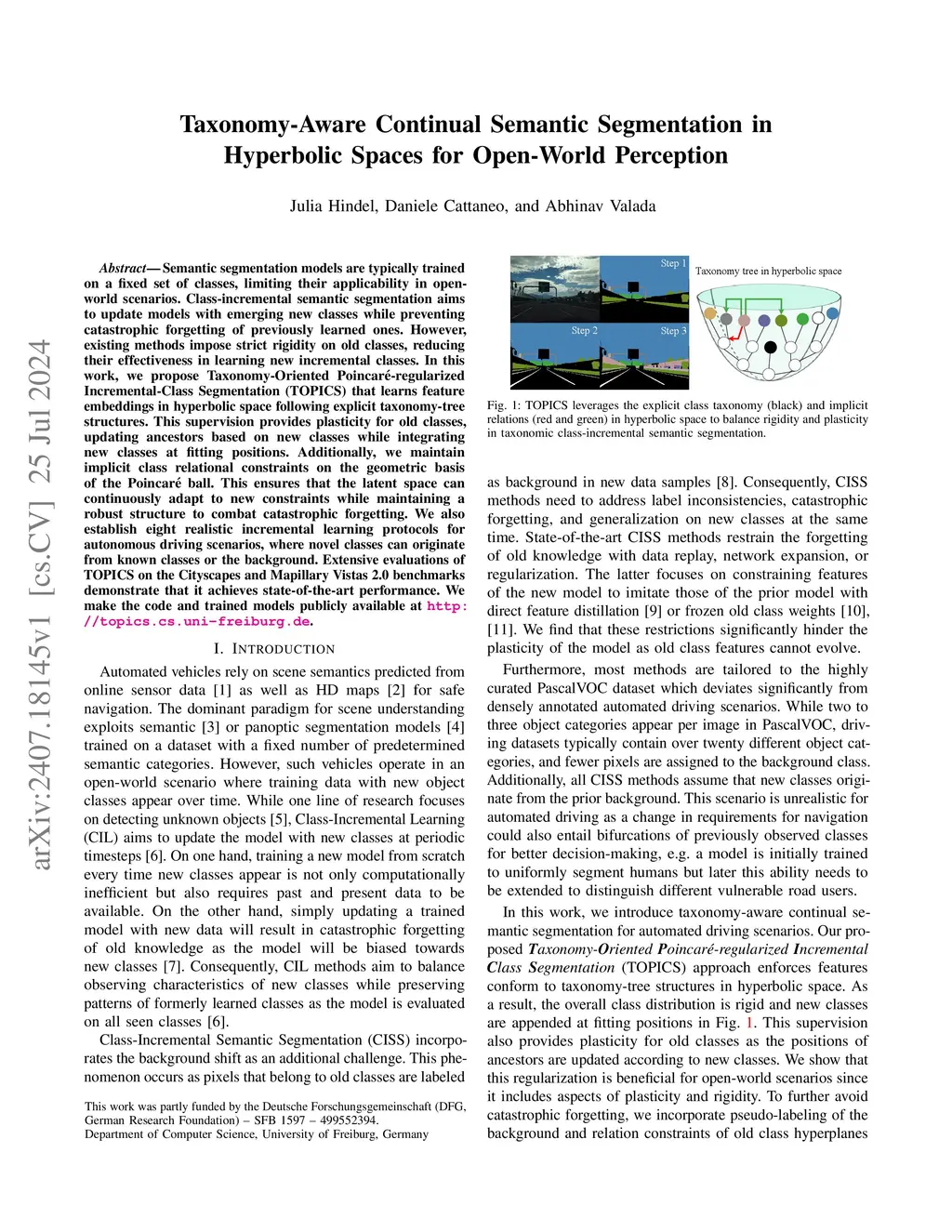 Semantic segmentation models are typically trained on a fixed set of classes, limiting their applicability in open-world scenarios. Class-incremental semantic segmentation aims to update models with emerging new classes while preventing catastrophic forgetting of previously learned ones. However, existing methods impose strict rigidity on old classes, reducing their effectiveness in learning new incremental classes. In this work, we propose Taxonomy-Oriented Poincar\é-regularized Incremental-Class Segmentation (TOPICS) that learns feature embeddings in hyperbolic space following explicit taxonomy-tree structures. This supervision provides plasticity for old classes, updating ancestors based on new classes while integrating new classes at fitting positions. Additionally, we maintain implicit class relational constraints on the geometric basis of the Poincar\é ball. This ensures that the latent space can continuously adapt to new constraints while maintaining a robust structure to combat catastrophic forgetting. We also establish eight realistic incremental learning protocols for autonomous driving scenarios, where novel classes can originate from known classes or the background. Extensive evaluations of TOPICS on the Cityscapes and Mapillary Vistas 2.0 benchmarks demonstrate that it achieves state-of-the-art performance. We make the code and trained models publicly available at http://topics.cs.uni-freiburg.de.