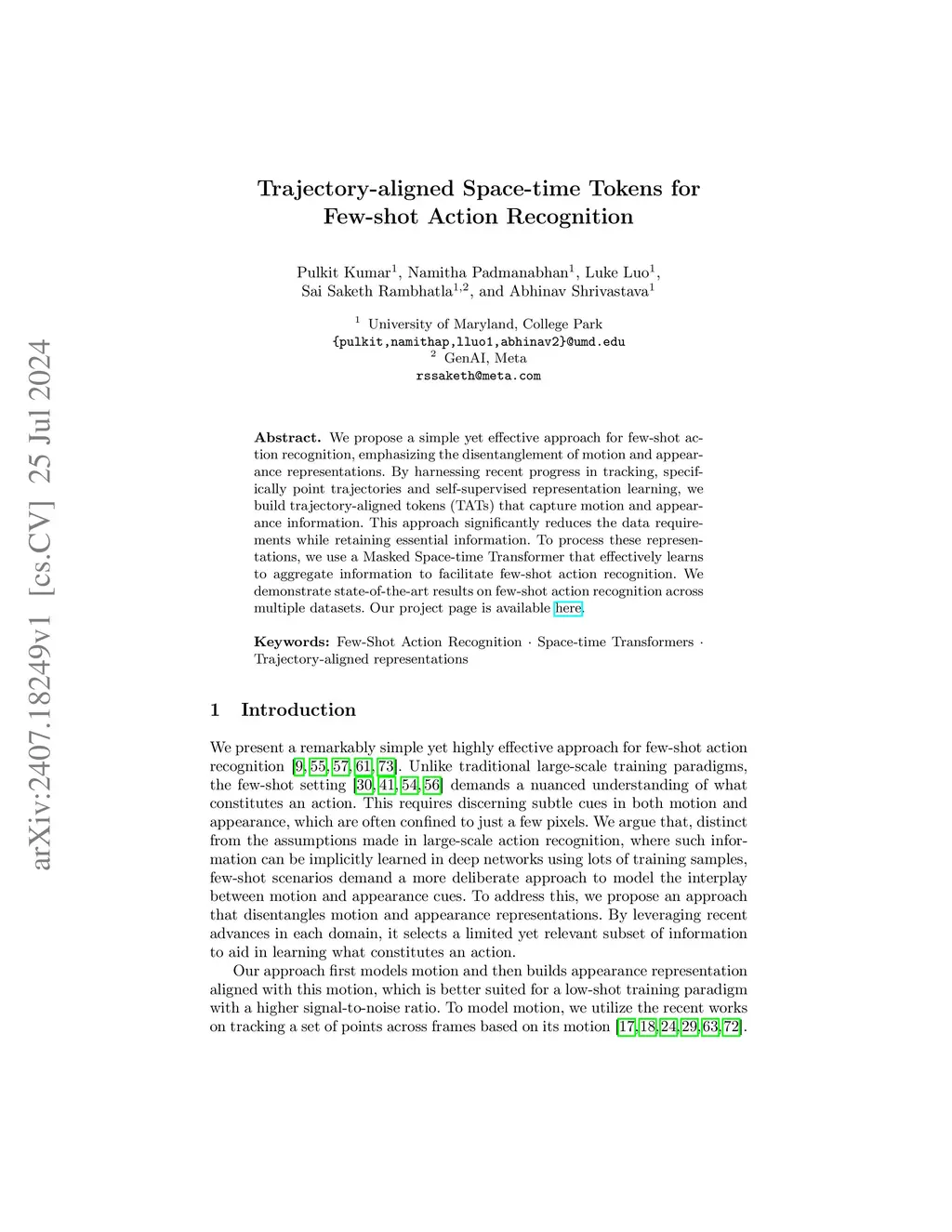We propose a simple yet effective approach for few-shot action recognition, emphasizing the disentanglement of motion and appearance representations. By harnessing recent progress in tracking, specifically point trajectories and self-supervised representation learning, we build trajectory-aligned tokens (TATs) that capture motion and appearance information. This approach significantly reduces the data requirements while retaining essential information. To process these representations, we use a Masked Space-time Transformer that effectively learns to aggregate information to facilitate few-shot action recognition. We demonstrate state-of-the-art results on few-shot action recognition across multiple datasets. Our project page is available at https://www.cs.umd.edu/~pulkit/tats
