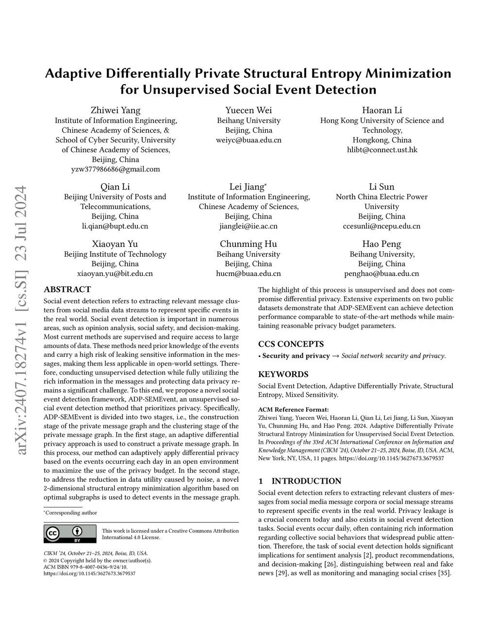 Social event detection refers to extracting relevant message clusters from social media data streams to represent specific events in the real world. Social event detection is important in numerous areas, such as opinion analysis, social safety, and decision-making. Most current methods are supervised and require access to large amounts of data. These methods need prior knowledge of the events and carry a high risk of leaking sensitive information in the messages, making them less applicable in open-world settings. Therefore, conducting unsupervised detection while fully utilizing the rich information in the messages and protecting data privacy remains a significant challenge. To this end, we propose a novel social event detection framework, ADP-SEMEvent, an unsupervised social event detection method that prioritizes privacy. Specifically, ADP-SEMEvent is divided into two stages, i.e., the construction stage of the private message graph and the clustering stage of the private message graph. In the first stage, an adaptive differential privacy approach is used to construct a private message graph. In this process, our method can adaptively apply differential privacy based on the events occurring each day in an open environment to maximize the use of the privacy budget. In the second stage, to address the reduction in data utility caused by noise, a novel 2-dimensional structural entropy minimization algorithm based on optimal subgraphs is used to detect events in the message graph. The highlight of this process is unsupervised and does not compromise differential privacy. Extensive experiments on two public datasets demonstrate that ADP-SEMEvent can achieve detection performance comparable to state-of-the-art methods while maintaining reasonable privacy budget parameters.