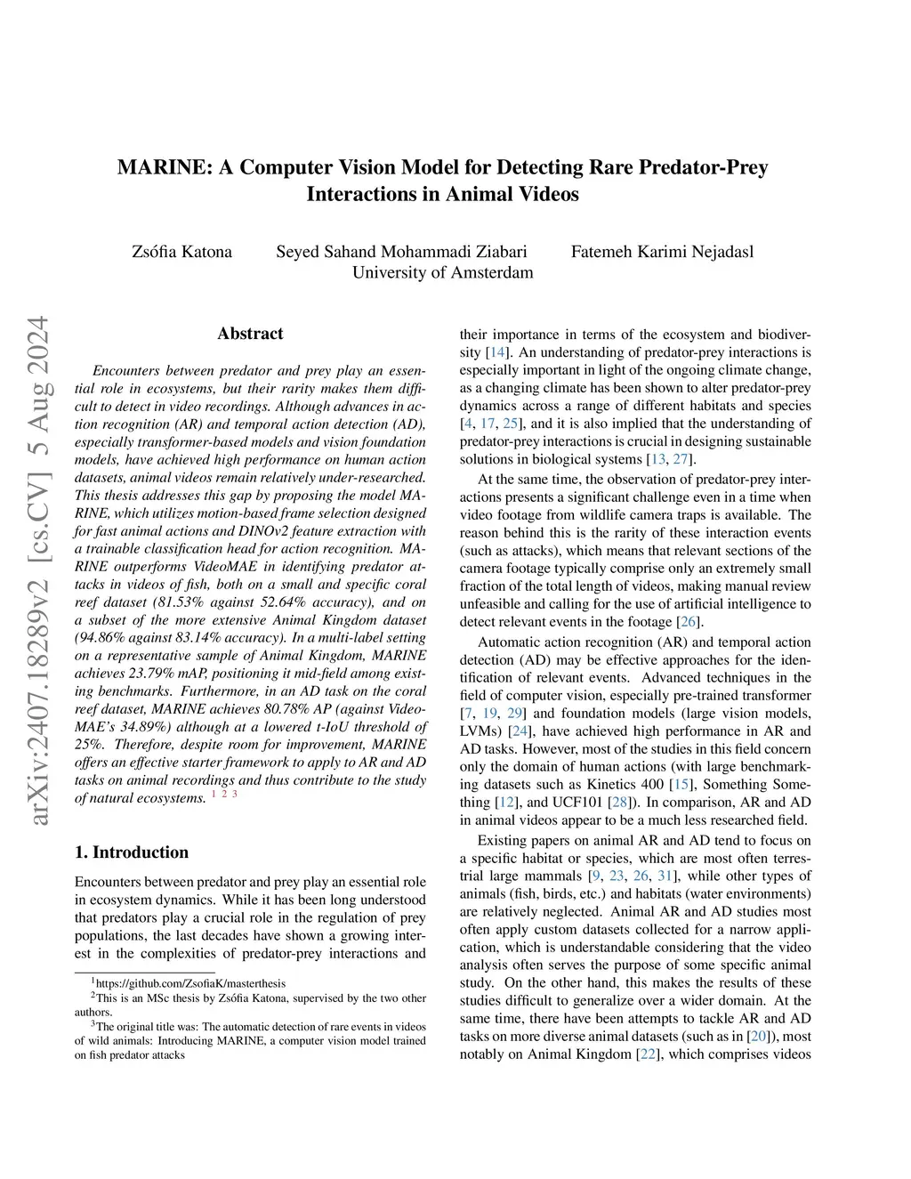 Encounters between predator and prey play an essential role in ecosystems, but their rarity makes them difficult to detect in video recordings. Although advances in action recognition (AR) and temporal action detection (AD), especially transformer-based models and vision foundation models, have achieved high performance on human action datasets, animal videos remain relatively under-researched. This thesis addresses this gap by proposing the model MARINE, which utilizes motion-based frame selection designed for fast animal actions and DINOv2 feature extraction with a trainable classification head for action recognition. MARINE outperforms VideoMAE in identifying predator attacks in videos of fish, both on a small and specific coral reef dataset (81.53\% against 52.64\% accuracy), and on a subset of the more extensive Animal Kingdom dataset (94.86\% against 83.14\% accuracy). In a multi-label setting on a representative sample of Animal Kingdom, MARINE achieves 23.79\% mAP, positioning it mid-field among existing benchmarks. Furthermore, in an AD task on the coral reef dataset, MARINE achieves 80.78\% AP (against VideoMAE's 34.89\%) although at a lowered t-IoU threshold of 25\%. Therefore, despite room for improvement, MARINE offers an effective starter framework to apply to AR and AD tasks on animal recordings and thus contribute to the study of natural ecosystems.