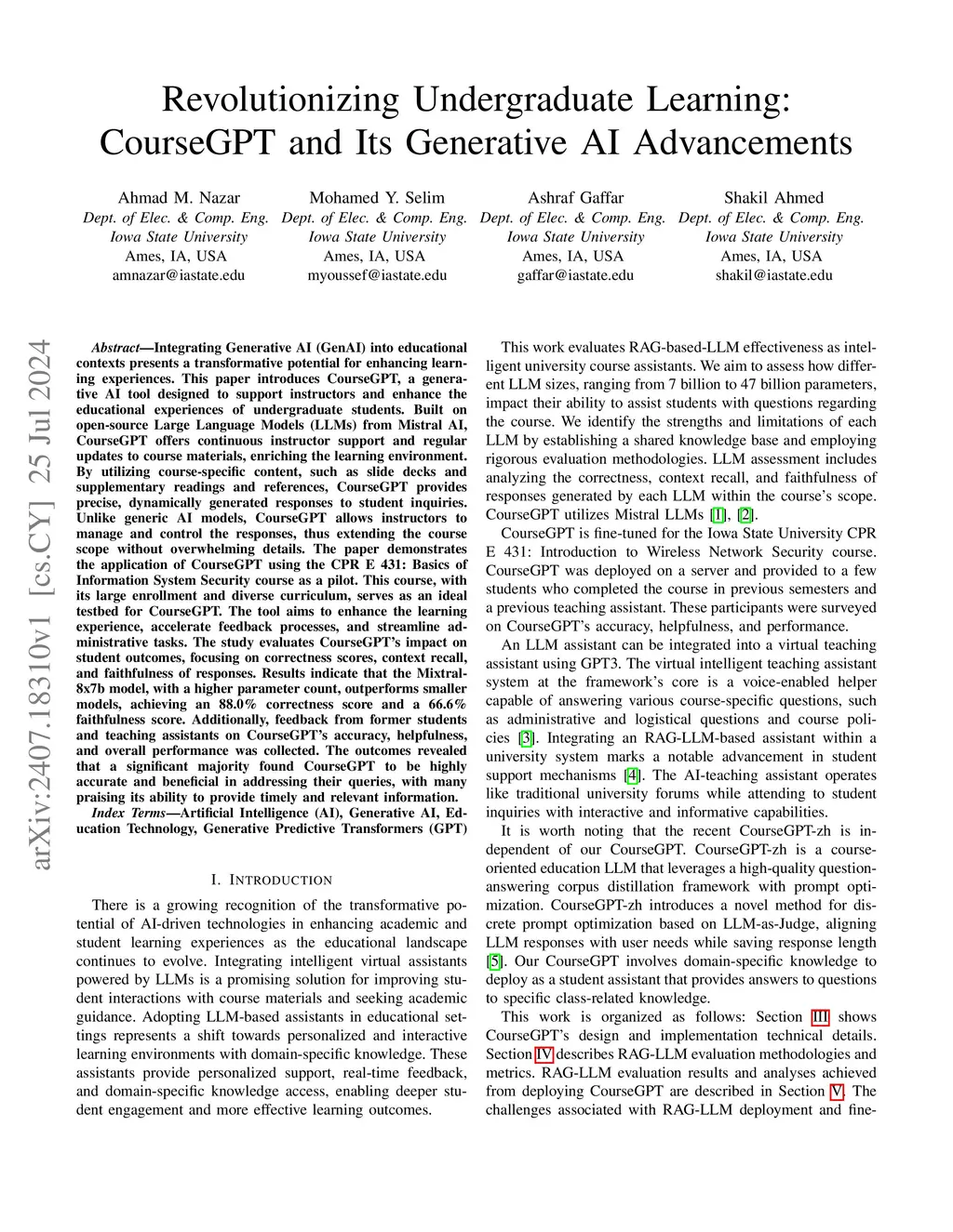 Integrating Generative AI (GenAI) into educational contexts presents a transformative potential for enhancing learning experiences. This paper introduces CourseGPT, a generative AI tool designed to support instructors and enhance the educational experiences of undergraduate students. Built on open-source Large Language Models (LLMs) from Mistral AI, CourseGPT offers continuous instructor support and regular updates to course materials, enriching the learning environment. By utilizing course-specific content, such as slide decks and supplementary readings and references, CourseGPT provides precise, dynamically generated responses to student inquiries. Unlike generic AI models, CourseGPT allows instructors to manage and control the responses, thus extending the course scope without overwhelming details. The paper demonstrates the application of CourseGPT using the CPR E 431 - Basics of Information System Security course as a pilot. This course, with its large enrollments and diverse curriculum, serves as an ideal testbed for CourseGPT. The tool aims to enhance the learning experience, accelerate feedback processes, and streamline administrative tasks. The study evaluates CourseGPT's impact on student outcomes, focusing on correctness scores, context recall, and faithfulness of responses. Results indicate that the Mixtral-8x7b model, with a higher parameter count, outperforms smaller models, achieving an 88.0% correctness score and a 66.6% faithfulness score. Additionally, feedback from former students and teaching assistants on CourseGPT's accuracy, helpfulness, and overall performance was collected. The outcomes revealed that a significant majority found CourseGPT to be highly accurate and beneficial in addressing their queries, with many praising its ability to provide timely and relevant information.