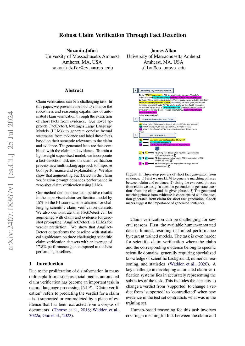 Claim verification can be a challenging task. In this paper, we present a method to enhance the robustness and reasoning capabilities of automated claim verification through the extraction of short facts from evidence. Our novel approach, FactDetect, leverages Large Language Models (LLMs) to generate concise factual statements from evidence and label these facts based on their semantic relevance to the claim and evidence. The generated facts are then combined with the claim and evidence. To train a lightweight supervised model, we incorporate a fact-detection task into the claim verification process as a multitasking approach to improve both performance and explainability. We also show that augmenting FactDetect in the claim verification prompt enhances performance in zero-shot claim verification using LLMs. Our method demonstrates competitive results in the supervised claim verification model by 15% on the F1 score when evaluated for challenging scientific claim verification datasets. We also demonstrate that FactDetect can be augmented with claim and evidence for zero-shot prompting (AugFactDetect) in LLMs for verdict prediction. We show that AugFactDetect outperforms the baseline with statistical significance on three challenging scientific claim verification datasets with an average of 17.3% performance gain compared to the best performing baselines.
