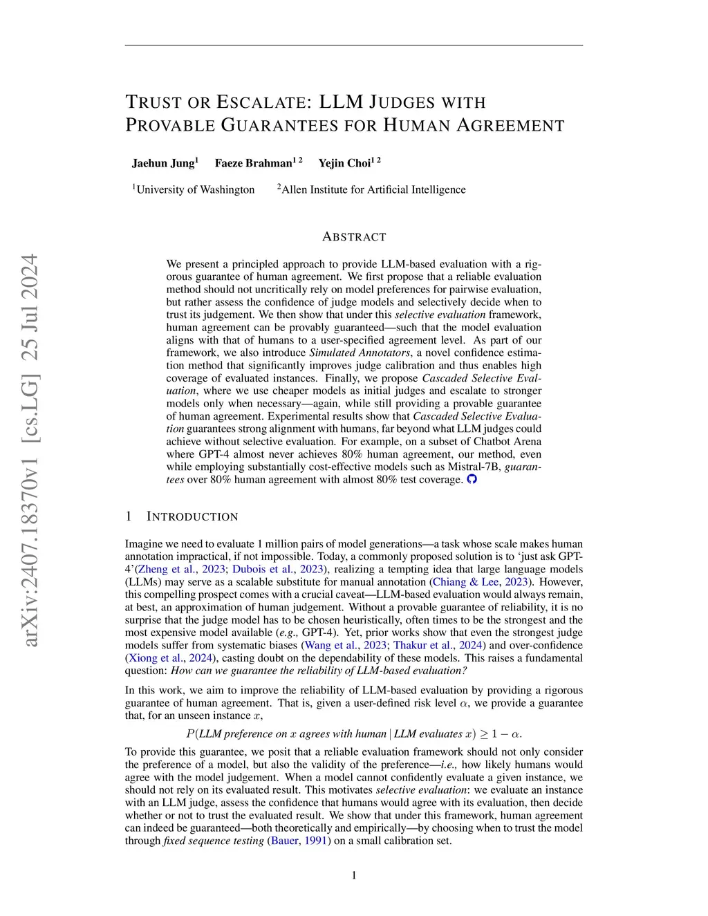 We present a principled approach to provide LLM-based evaluation with a rigorous guarantee of human agreement. We first propose that a reliable evaluation method should not uncritically rely on model preferences for pairwise evaluation, but rather assess the confidence of judge models and selectively decide when to trust its judgement. We then show that under this selective evaluation framework, human agreement can be provably guaranteed -- such that the model evaluation aligns with that of humans to a user-specified agreement level. As part of our framework, we also introduce Simulated Annotators, a novel confidence estimation method that significantly improves judge calibration and thus enables high coverage of evaluated instances. Finally, we propose Cascaded Selective Evaluation, where we use cheaper models as initial judges and escalate to stronger models only when necessary -- again, while still providing a provable guarantee of human agreement. Experimental results show that Cascaded Selective Evaluation guarantees strong alignment with humans, far beyond what LLM judges could achieve without selective evaluation. For example, on a subset of Chatbot Arena where GPT-4 almost never achieves 80% human agreement, our method, even while employing substantially cost-effective models such as Mistral-7B, guarantees over 80% human agreement with almost 80% test coverage.