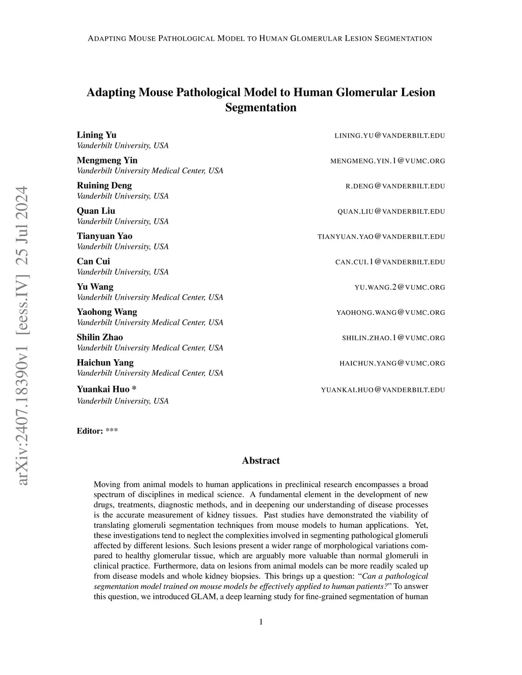 Moving from animal models to human applications in preclinical research encompasses a broad spectrum of disciplines in medical science. A fundamental element in the development of new drugs, treatments, diagnostic methods, and in deepening our understanding of disease processes is the accurate measurement of kidney tissues. Past studies have demonstrated the viability of translating glomeruli segmentation techniques from mouse models to human applications. Yet, these investigations tend to neglect the complexities involved in segmenting pathological glomeruli affected by different lesions. Such lesions present a wider range of morphological variations compared to healthy glomerular tissue, which are arguably more valuable than normal glomeruli in clinical practice. Furthermore, data on lesions from animal models can be more readily scaled up from disease models and whole kidney biopsies. This brings up a question: ``\textit{Can a pathological segmentation model trained on mouse models be effectively applied to human patients?}" To answer this question, we introduced GLAM, a deep learning study for fine-grained segmentation of human kidney lesions using a mouse model, addressing mouse-to-human transfer learning, by evaluating different learning strategies for segmenting human pathological lesions using zero-shot transfer learning and hybrid learning by leveraging mouse samples. From the results, the hybrid learning model achieved superior performance.
