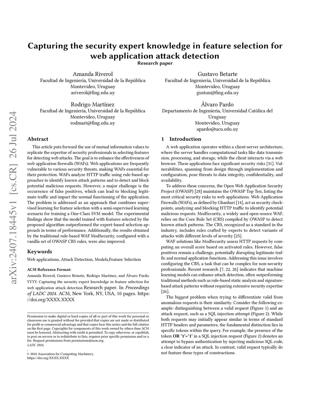 This article puts forward the use of mutual information values to replicate the expertise of security professionals in selecting features for detecting web attacks. The goal is to enhance the effectiveness of web application firewalls (WAFs). Web applications are frequently vulnerable to various security threats, making WAFs essential for their protection. WAFs analyze HTTP traffic using rule-based approaches to identify known attack patterns and to detect and block potential malicious requests. However, a major challenge is the occurrence of false positives, which can lead to blocking legitimate traffic and impact the normal functioning of the application. The problem is addressed as an approach that combines supervised learning for feature selection with a semi-supervised learning scenario for training a One-Class SVM model. The experimental findings show that the model trained with features selected by the proposed algorithm outperformed the expert-based selection approach in terms of performance. Additionally, the results obtained by the traditional rule-based WAF ModSecurity, configured with a vanilla set of OWASP CRS rules, were also improved.