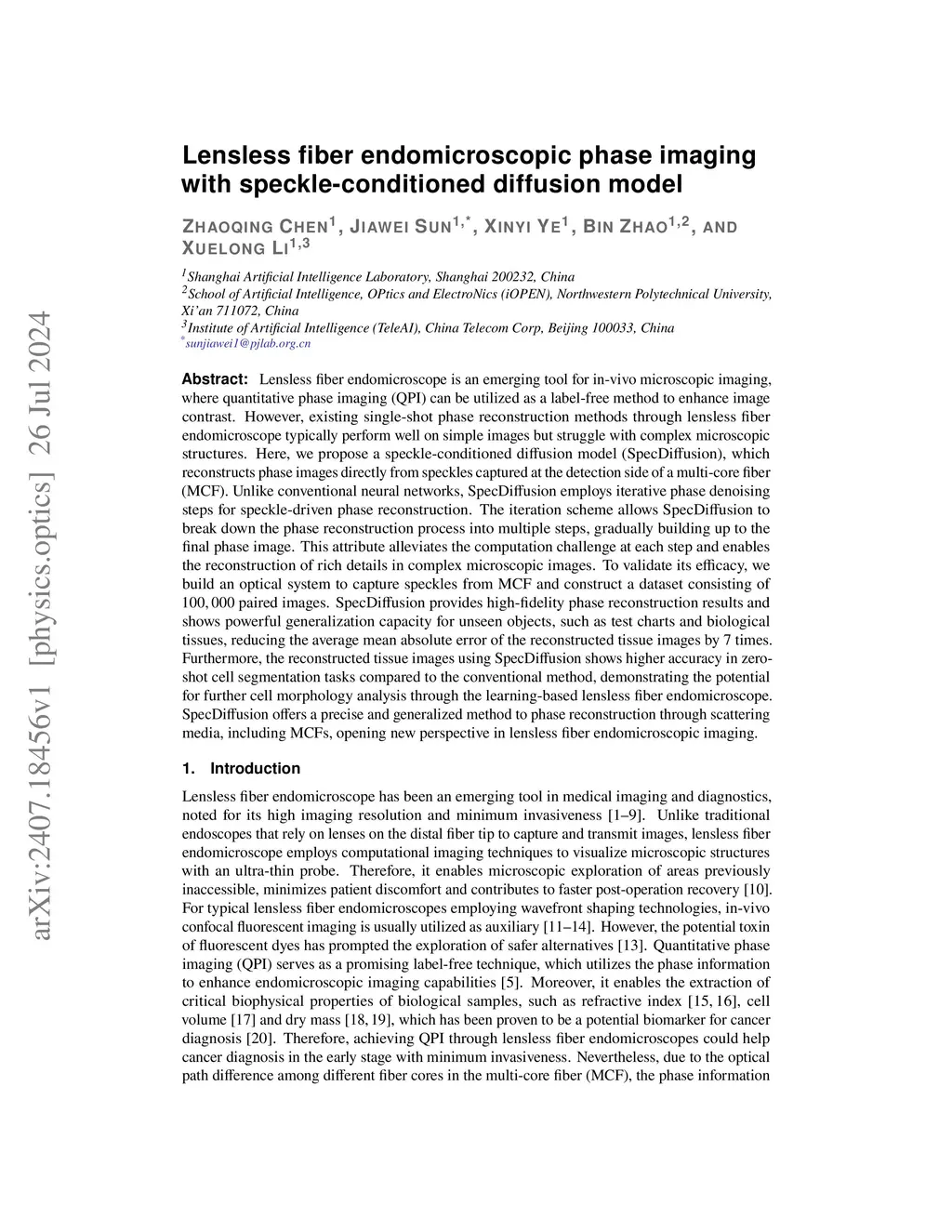 Lensless fiber endomicroscope is an emerging tool for in-vivo microscopic imaging, where quantitative phase imaging (QPI) can be utilized as a label-free method to enhance image contrast. However, existing single-shot phase reconstruction methods through lensless fiber endomicroscope typically perform well on simple images but struggle with complex microscopic structures. Here, we propose a speckle-conditioned diffusion model (SpecDiffusion), which reconstructs phase images directly from speckles captured at the detection side of a multi-core fiber (MCF). Unlike conventional neural networks, SpecDiffusion employs iterative phase denoising steps for speckle-driven phase reconstruction. The iteration scheme allows SpecDiffusion to break down the phase reconstruction process into multiple steps, gradually building up to the final phase image. This attribute alleviates the computation challenge at each step and enables the reconstruction of rich details in complex microscopic images. To validate its efficacy, we build an optical system to capture speckles from MCF and construct a dataset consisting of 100,000 paired images. SpecDiffusion provides high-fidelity phase reconstruction results and shows powerful generalization capacity for unseen objects, such as test charts and biological tissues, reducing the average mean absolute error of the reconstructed tissue images by 7 times. Furthermore, the reconstructed tissue images using SpecDiffusion shows higher accuracy in zero-shot cell segmentation tasks compared to the conventional method, demonstrating the potential for further cell morphology analysis through the learning-based lensless fiber endomicroscope. SpecDiffusion offers a precise and generalized method to phase reconstruction through scattering media, including MCFs, opening new perspective in lensless fiber endomicroscopic imaging.