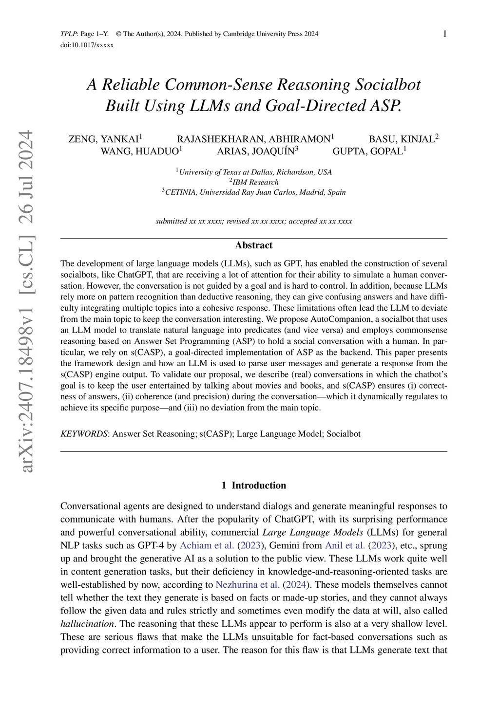 The development of large language models (LLMs), such as GPT, has enabled the construction of several socialbots, like ChatGPT, that are receiving a lot of attention for their ability to simulate a human conversation. However, the conversation is not guided by a goal and is hard to control. In addition, because LLMs rely more on pattern recognition than deductive reasoning, they can give confusing answers and have difficulty integrating multiple topics into a cohesive response. These limitations often lead the LLM to deviate from the main topic to keep the conversation interesting. We propose AutoCompanion, a socialbot that uses an LLM model to translate natural language into predicates (and vice versa) and employs commonsense reasoning based on Answer Set Programming (ASP) to hold a social conversation with a human. In particular, we rely on s(CASP), a goal-directed implementation of ASP as the backend. This paper presents the framework design and how an LLM is used to parse user messages and generate a response from the s(CASP) engine output. To validate our proposal, we describe (real) conversations in which the chatbot's goal is to keep the user entertained by talking about movies and books, and s(CASP) ensures (i) correctness of answers, (ii) coherence (and precision) during the conversation, which it dynamically regulates to achieve its specific purpose, and (iii) no deviation from the main topic.