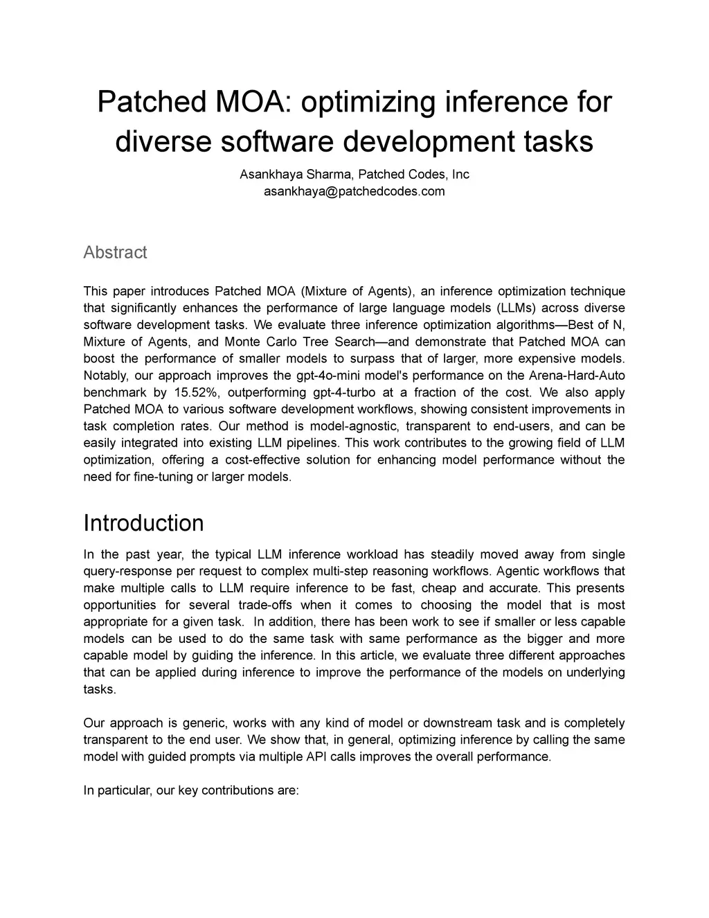 This paper introduces Patched MOA (Mixture of Agents), an inference optimization technique that significantly enhances the performance of large language models (LLMs) across diverse software development tasks. We evaluate three inference optimization algorithms - Best of N, Mixture of Agents, and Monte Carlo Tree Search and demonstrate that Patched MOA can boost the performance of smaller models to surpass that of larger, more expensive models. Notably, our approach improves the gpt-4o-mini model's performance on the Arena-Hard-Auto benchmark by 15.52%, outperforming gpt-4-turbo at a fraction of the cost. We also apply Patched MOA to various software development workflows, showing consistent improvements in task completion rates. Our method is model-agnostic, transparent to end-users, and can be easily integrated into existing LLM pipelines. This work contributes to the growing field of LLM optimization, offering a cost-effective solution for enhancing model performance without the need for fine-tuning or larger models. Our implementation is open-source and available atthis https URL.