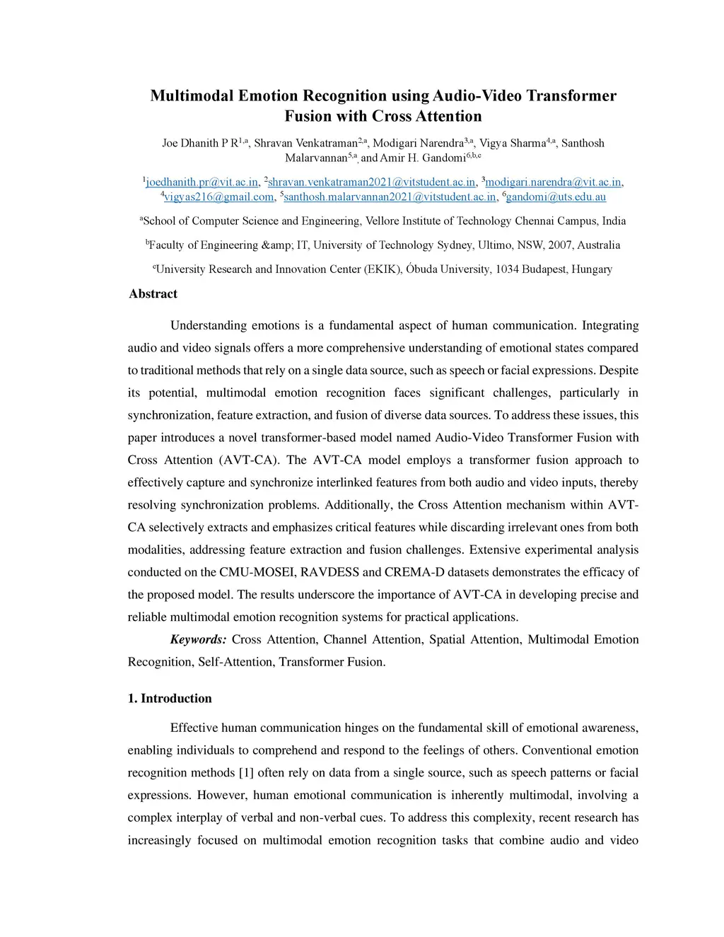 Multimodal Emotion Recognition using Audio-Video Transformer Fusion with Cross Attention
