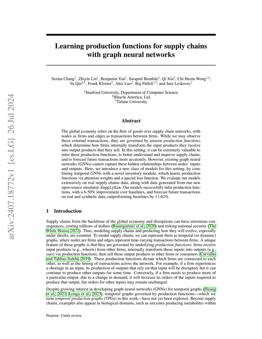 The global economy relies on the flow of goods over supply chain networks, with nodes as firms and edges as transactions between firms. While we may observe these external transactions, they are governed by unseen production functions, which determine how firms internally transform the input products they receive into output products that they sell. In this setting, it can be extremely valuable to infer these production functions, to improve supply chain visibility and to forecast future transactions more accurately. However, existing graph neural networks (GNNs) cannot capture these hidden relationships between nodes' inputs and outputs. Here, we introduce a new class of models for this setting by combining temporal GNNs with a novel inventory module, which learns production functions via attention weights and a special loss function. We evaluate our models extensively on real supply chains data and data generated from our new open-source simulator, SupplySim. Our models successfully infer production functions, outperforming the strongest baseline by 6%-50% (across datasets), and forecast future transactions, outperforming the strongest baseline by 11%-62%