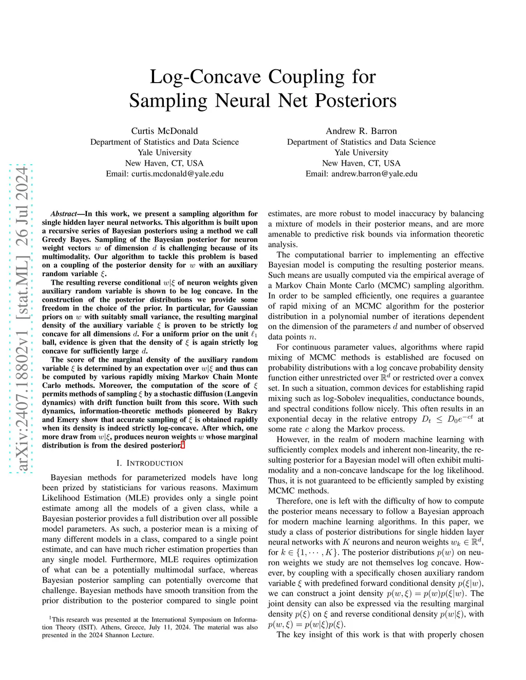 In this work, we present a sampling algorithm for single hidden layer neural networks. This algorithm is built upon a recursive series of Bayesian posteriors using a method we call Greedy Bayes. Sampling of the Bayesian posterior for neuron weight vectors of dimension is challenging because of its multimodality. Our algorithm to tackle this problem is based on a coupling of the posterior density for with an auxiliary random variable . The resulting reverse conditional of neuron weights given auxiliary random variable is shown to be log concave. In the construction of the posterior distributions we provide some freedom in the choice of the prior. In particular, for Gaussian priors on with suitably small variance, the resulting marginal density of the auxiliary variable is proven to be strictly log concave for all dimensions . For a uniform prior on the unit ball, evidence is given that the density of is again strictly log concave for sufficiently large . The score of the marginal density of the auxiliary random variable is determined by an expectation over and thus can be computed by various rapidly mixing Markov Chain Monte Carlo methods. Moreover, the computation of the score of permits methods of sampling by a stochastic diffusion (Langevin dynamics) with drift function built from this score. With such dynamics, information-theoretic methods pioneered by Bakry and Emery show that accurate sampling of is obtained rapidly when its density is indeed strictly log-concave. After which, one more draw from , produces neuron weights whose marginal distribution is from the desired posterior.