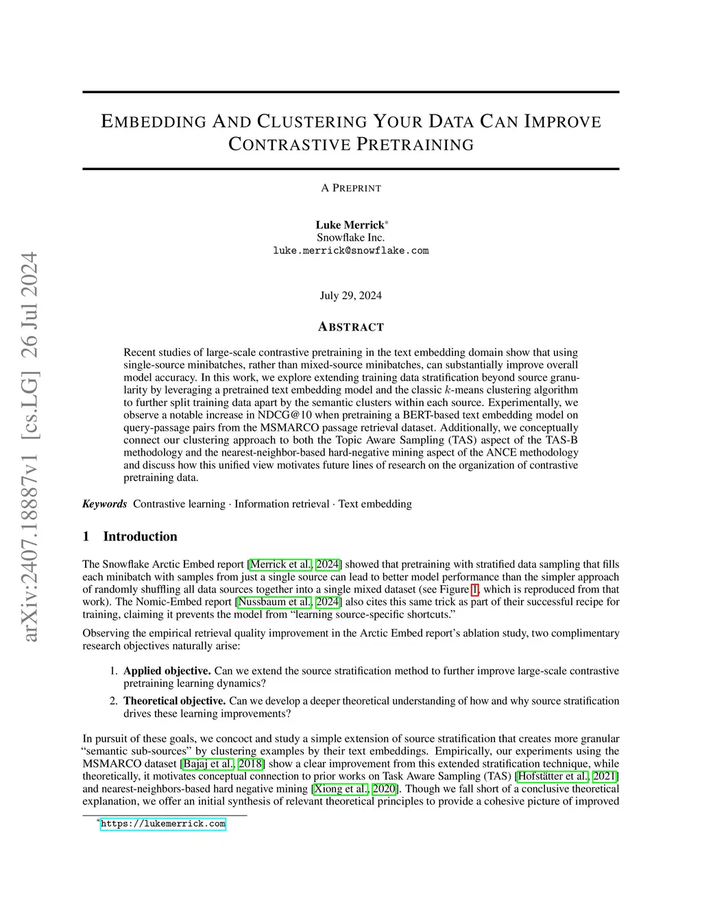 Recent studies of large-scale contrastive pretraining in the text embedding domain show that using single-source minibatches, rather than mixed-source minibatches, can substantially improve overall model accuracy. In this work, we explore extending training data stratification beyond source granularity by leveraging a pretrained text embedding model and the classic k-means clustering algorithm to further split training data apart by the semantic clusters within each source. Experimentally, we observe a notable increase in NDCG@10 when pretraining a BERT-based text embedding model on query-passage pairs from the MSMARCO passage retrieval dataset. Additionally, we conceptually connect our clustering approach to both the Topic Aware Sampling (TAS) aspect of the TAS-B methodology and the nearest-neighbor-based hard-negative mining aspect of the ANCE methodology and discuss how this unified view motivates future lines of research on the organization of contrastive pretraining data.
