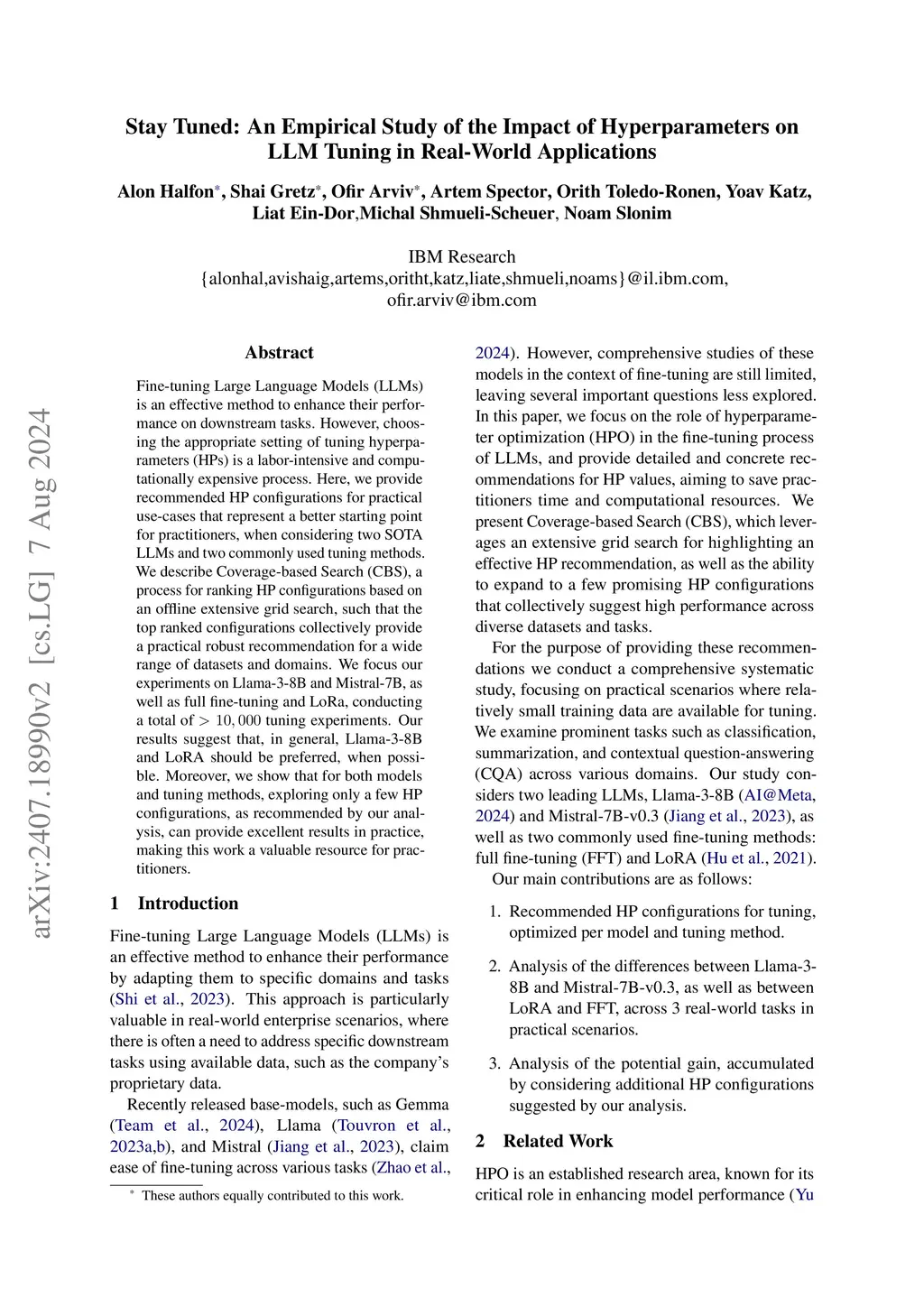 Fine-tuning Large Language Models (LLMs) is an effective method to enhance their performance on downstream tasks. However, choosing the appropriate setting of tuning hyperparameters (HPs) is a labor-intensive and computationally expensive process. Here, we provide recommended HP configurations for practical use-cases that represent a better starting point for practitioners, when considering two SOTA LLMs and two commonly used tuning methods. We describe Coverage-based Search (CBS), a process for ranking HP configurations based on an offline extensive grid search, such that the top ranked configurations collectively provide a practical robust recommendation for a wide range of datasets and domains. We focus our experiments on Llama-3-8B and Mistral-7B, as well as full fine-tuning and LoRa, conducting a total of > 10,000 tuning experiments. Our results suggest that, in general, Llama-3-8B and LoRA should be preferred, when possible. Moreover, we show that for both models and tuning methods, exploring only a few HP configurations, as recommended by our analysis, can provide excellent results in practice, making this work a valuable resource for practitioners.