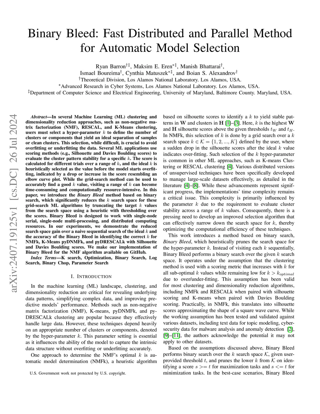 In several Machine Learning (ML) clustering and dimensionality reduction approaches, such as non-negative matrix factorization (NMF), RESCAL, and K-Means clustering, users must select a hyper-parameter k to define the number of clusters or components that yield an ideal separation of samples or clean clusters. This selection, while difficult, is crucial to avoid overfitting or underfitting the data. Several ML applications use scoring methods (e.g., Silhouette and Davies Boulding scores) to evaluate the cluster pattern stability for a specific k. The score is calculated for different trials over a range of k, and the ideal k is heuristically selected as the value before the model starts overfitting, indicated by a drop or increase in the score resembling an elbow curve plot. While the grid-search method can be used to accurately find a good k value, visiting a range of k can become time-consuming and computationally resource-intensive. In this paper, we introduce the Binary Bleed method based on binary search, which significantly reduces the k search space for these grid-search ML algorithms by truncating the target k values from the search space using a heuristic with thresholding over the scores. Binary Bleed is designed to work with single-node serial, single-node multi-processing, and distributed computing resources. In our experiments, we demonstrate the reduced search space gain over a naive sequential search of the ideal k and the accuracy of the Binary Bleed in identifying the correct k for NMFk, K-Means pyDNMFk, and pyDRESCALk with Silhouette and Davies Boulding scores. We make our implementation of Binary Bleed for the NMF algorithm available on GitHub.